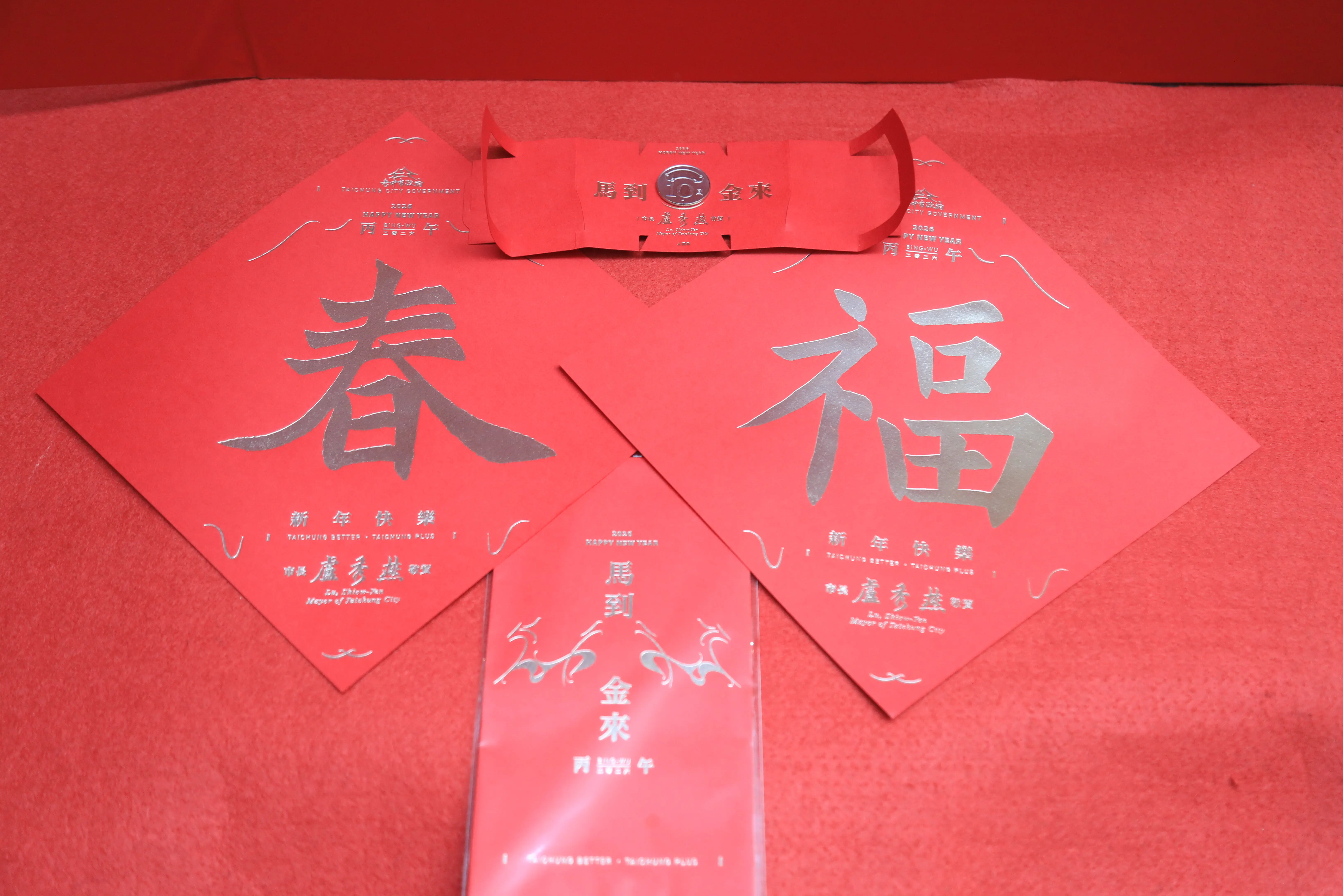 秘書處說明,今年度的家戶版春聯「馬上有錢」將由各區公所發給各家戶運用;另外2款「超級馬利」及「龍馬有春」為限量款限量發送。此外,每年深受市民喜愛的創意春聯、紅包袋和10元紅包福袋,都以馬造型設計的主視覺為主。除10元紅包福袋外,以上3款傳統賀聯、創意春聯、單字春聯及紅包袋,自1月30日起,民眾可在市府台灣大道新市政服務中心及陽明市政大樓服務中心限量索取,10元紅包福袋則另行公佈領取地點,數量有限送完為止。