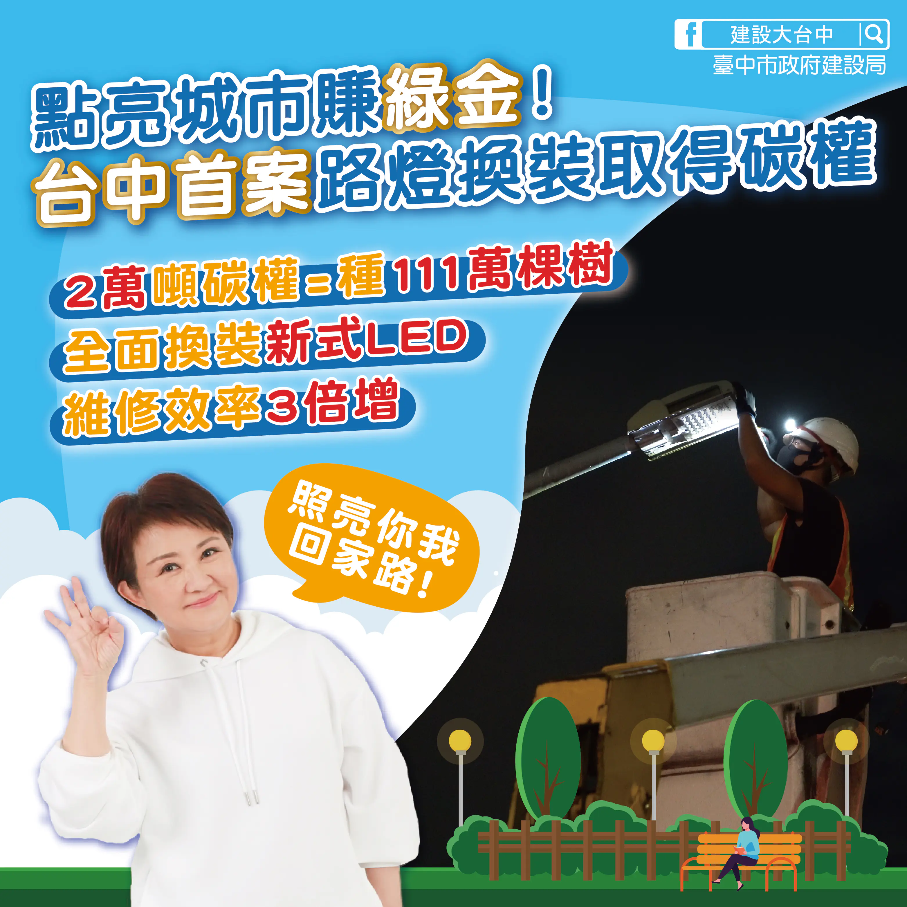 台中市政府建設局長陳大田表示,市長盧秀燕重視城市安全與永續發展,積極推動節能減碳政策,「碳權」即是將減少的碳排放量經查證、認證後轉化為具體的環境資產。市府於113年完成1960盞高耗能鈉光路燈汰換,全面改採高效率LED燈具,並於多處重要路口設置4臂燈桿,提高照度與照明均勻度,讓行人通行更加安全,也同步大幅降低用電量與碳排放,兼顧公共安全、財政永續與淨零目標。