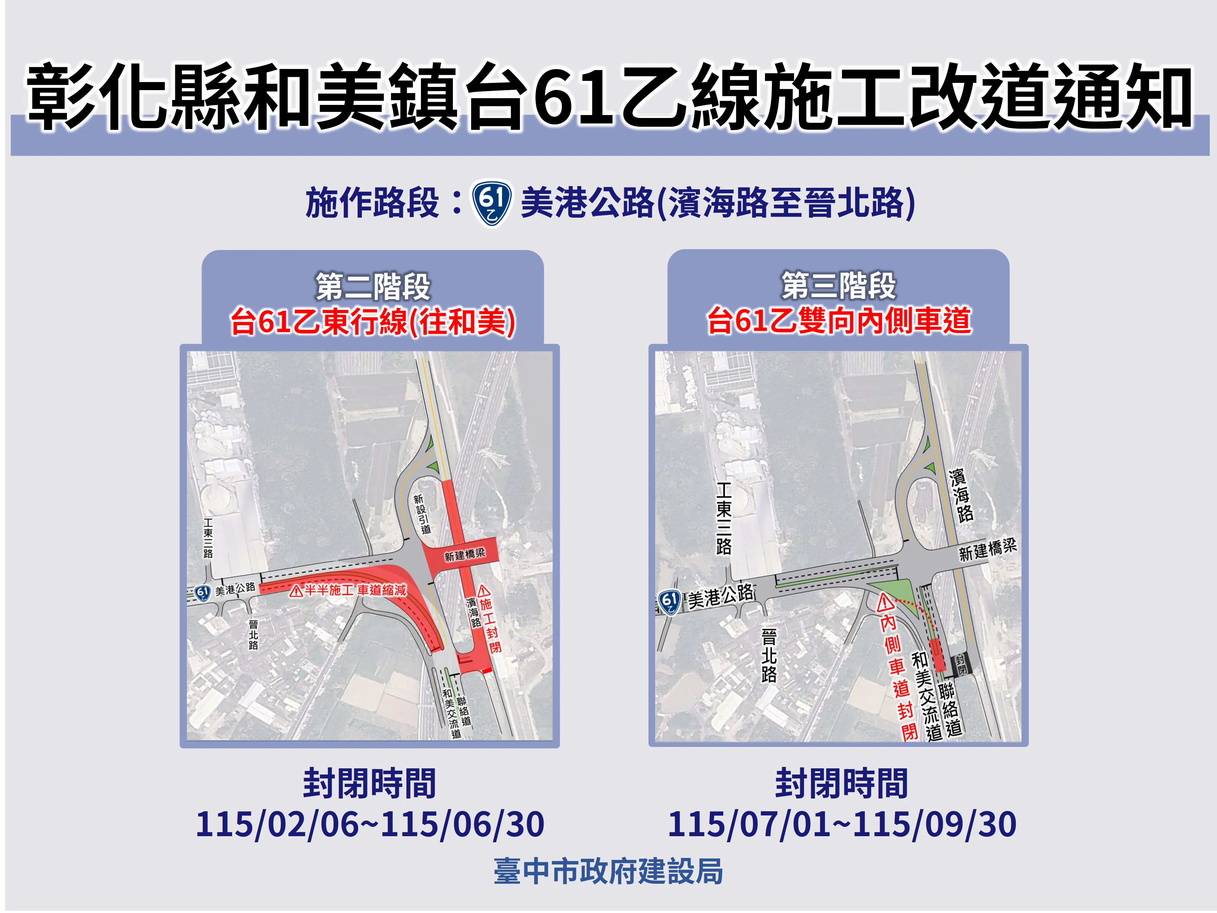 建設局表示,第二階段交通管制將封閉台61乙東行線(往和美方向),並改道至西行線,原雙車道將調整為「雙向各一車道通行」,濱海路(國道三號橋下路段)亦同步封閉。建設局提醒,若有必要行駛濱海路需求之車輛,可改走本工程新設引道通行;另可參考建議改道路線(詳見改道替代路線圖),提前規劃行程以避開易壅塞路段,並遵守現場管制引導,減速慢行,注意行車安全。