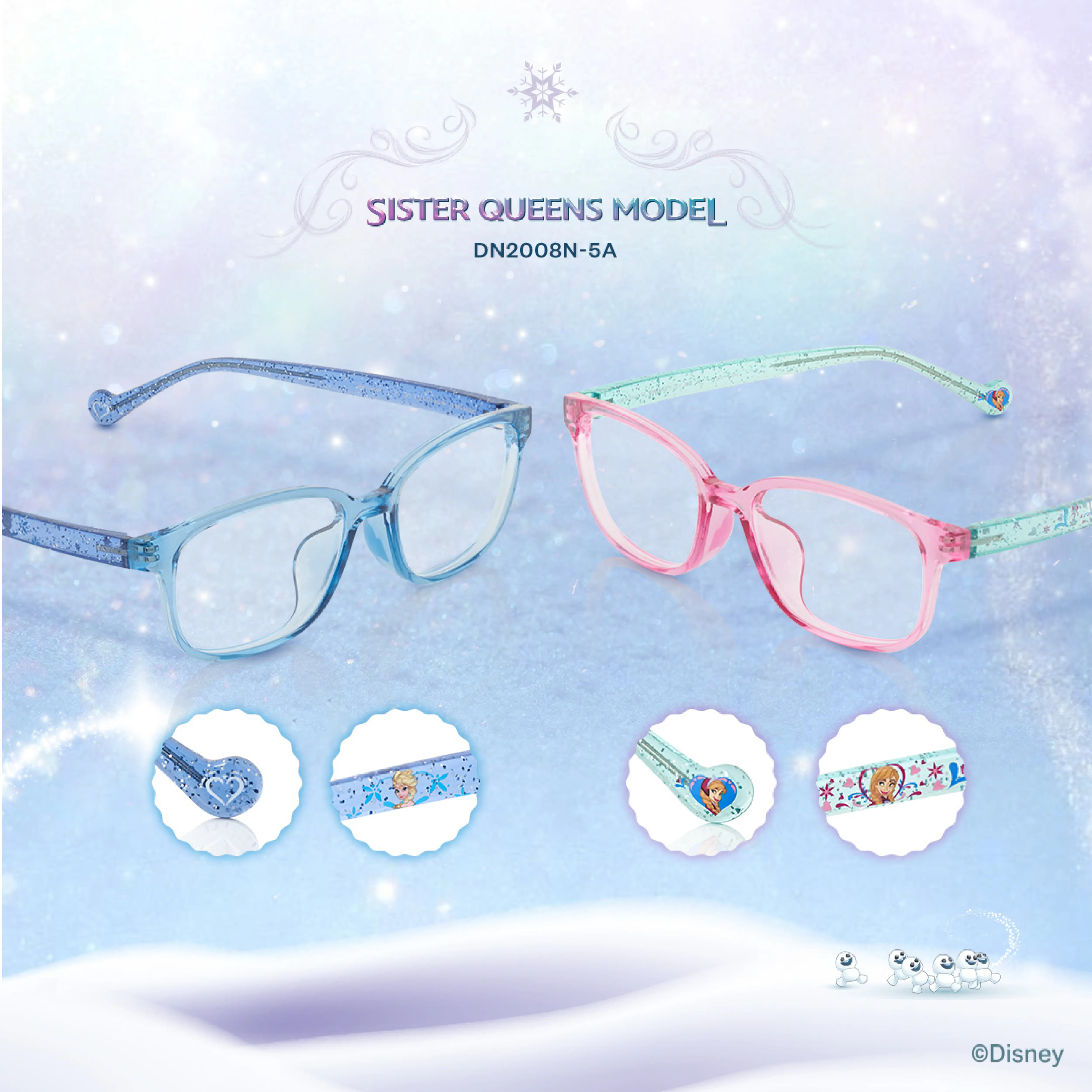 本次系列共推出 5 款特別設計,靈感源自艾莎的冷冽高貴與安娜的溫暖堅毅。OWNDAYS 設計團隊在工藝上進行了奢華升級,每副眼鏡皆隱藏著讓粉絲驚喜的設計細節,鏡腳鑲嵌來自奧地利的施華洛世奇(Swarovski)水晶,隨著光線折射出璀璨光芒;鏡腳尾端則運用雷射雕刻或特殊切削工藝,重現雪花、艾倫戴爾國花等經典元素,將《冰雪奇緣》的奇幻世界濃縮於鏡框之中。