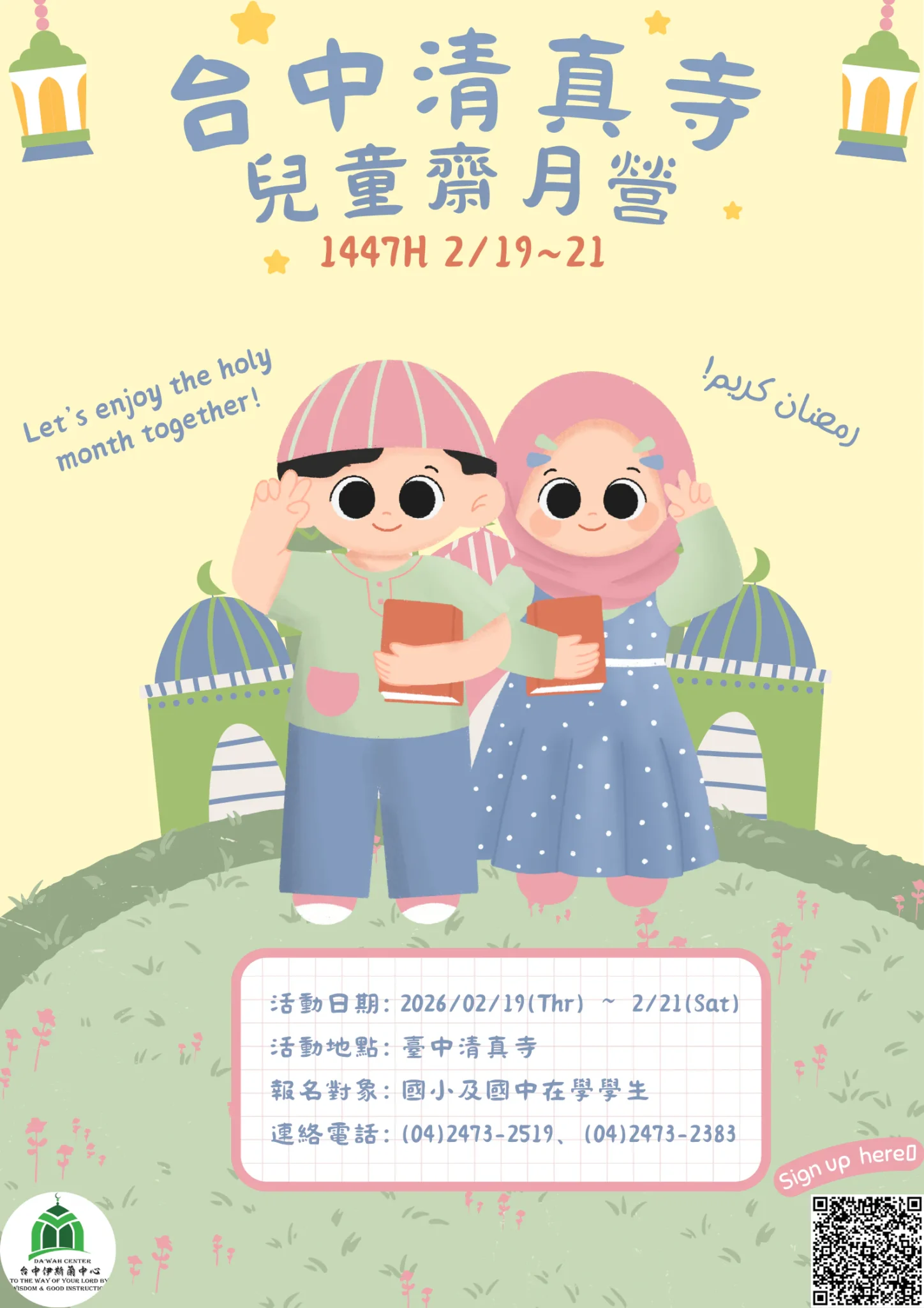 伊斯蘭很神秘?清真寺拜什麼?齋月不吃不喝不餓嗎?如果你心中也有這些問號?財團法人台中伊斯蘭清真寺「2026(伊曆1447年)兒童齋月營」現正受理報名中,歡迎國小及國中在學學生踴躍參加。在大哥哥大姐姐的帶領下,透過生動有趣的方式,帶領孩子們學習伊斯蘭知識,練習封齋,在歡笑中成長,經過3天2夜的封齋、禮拜、讀經、開齋及認識清真商品等課程寓教於樂,名額有限,而且完全免費。