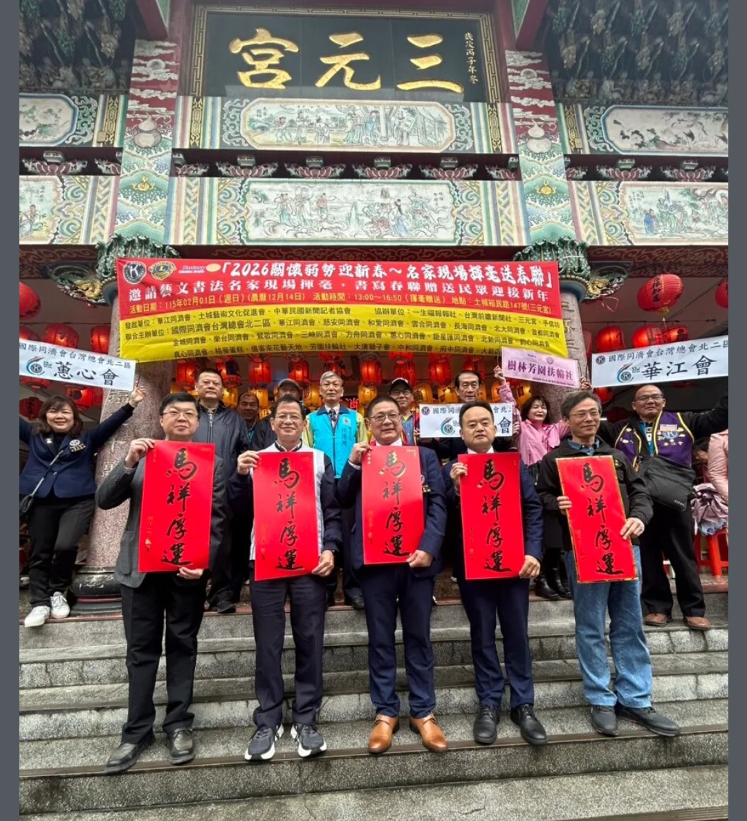為迎接農曆新年的到來,傳遞關懷與祝福,由華江同濟會、土城藝術文化促進會與中華民國新聞記者協會共同發起,偕同同濟會 獅子會 扶輪社共同聯合主辦於115年2月1日下午1時至5時在新北市土城三元宮辦理「關懷弱勢迎新春 名家現場揮毫送春聯」公益活動,邀請書法名家現場揮毫,將滿滿的年味與祝福送到社區民眾與弱勢家庭手中。