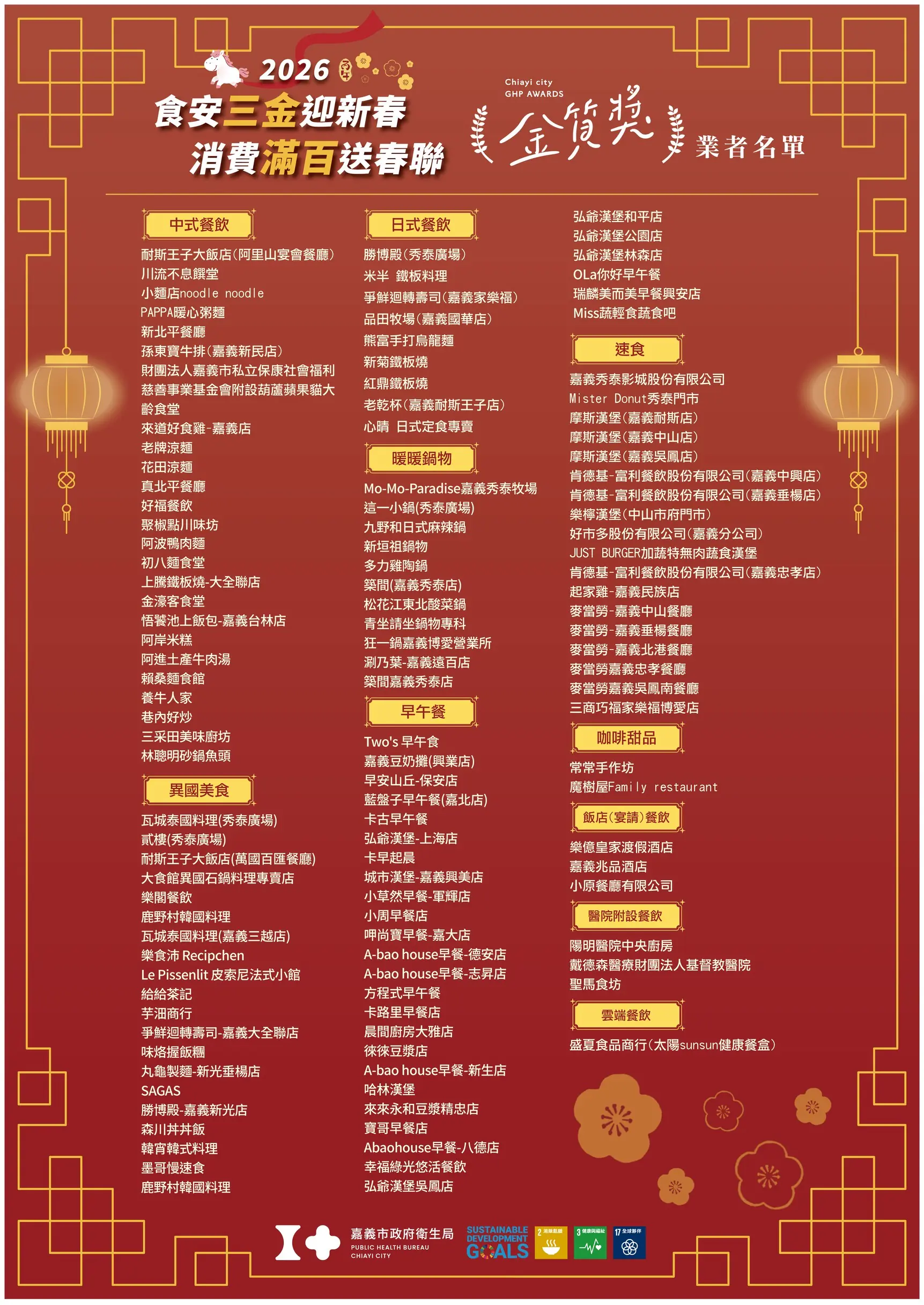 迎接農曆春節消費熱潮,嘉義市政府衛生局配合嘉義市政府推動振興經濟、普發現金6,000元政策,今(2)日攜手榮獲「食安三金獎」的優質店家舉辦2026「食安三金迎新春 消費滿百送春聯」活動記者會,正式宣布活動開跑。自115年2月2日起,凡至食安三金獎店家消費滿100元以上,即可獲得具馬年吉祥寓意的限量「方斗春聯」1套,數量有限,送完為止。期盼透過活動鼓勵市民優先選擇通過食品衛生評核的安心好店,讓大家「吃得安心、買得放心」,歡喜迎新年。