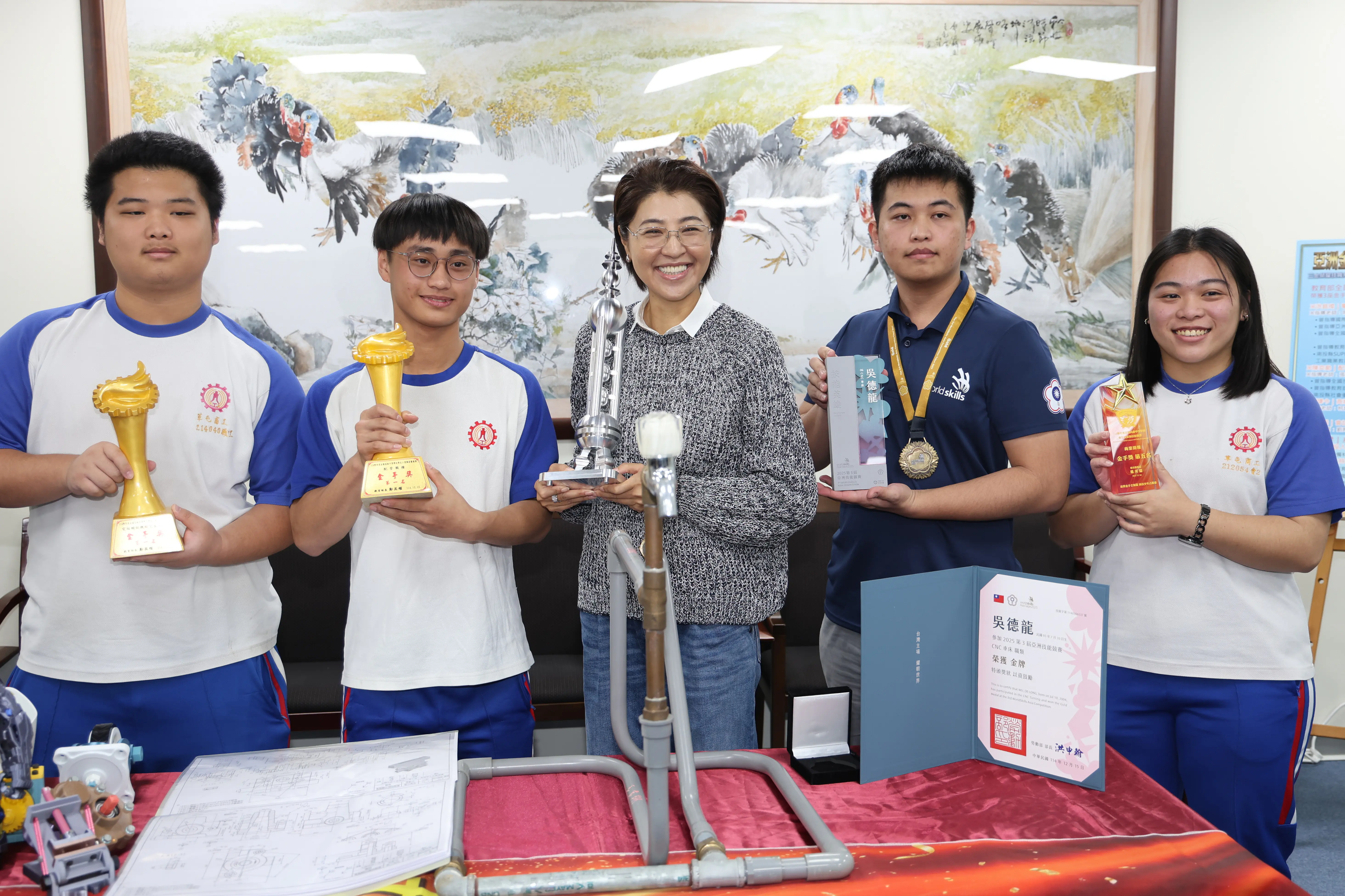 獲獎師生名單:吳德龍(選手)、藍文祥(指導老師):亞洲技能競賽CNC車床金牌。洪銘璨(選手)、陳永正(指導老師):全國技藝競賽電腦輔助機械製圖第一名。陳奕勛(選手)、張政傑(指導老師):全國技藝競賽配管第一名。張譯今(選手)、柯智馨(指導老師):全國技藝競賽第五名。