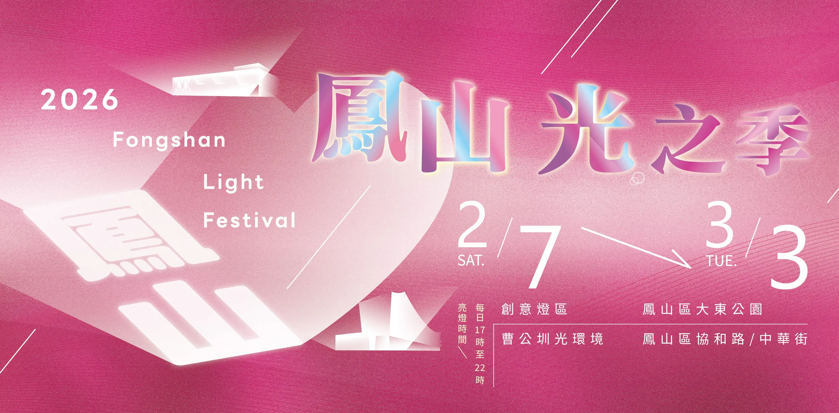 「2026鳳山光之季」於2月7日在大東公園盛大展開,自2月7日至3月3日元宵節止,展期共25天,每日17至22亮燈,陪伴民眾歡喜過新年。