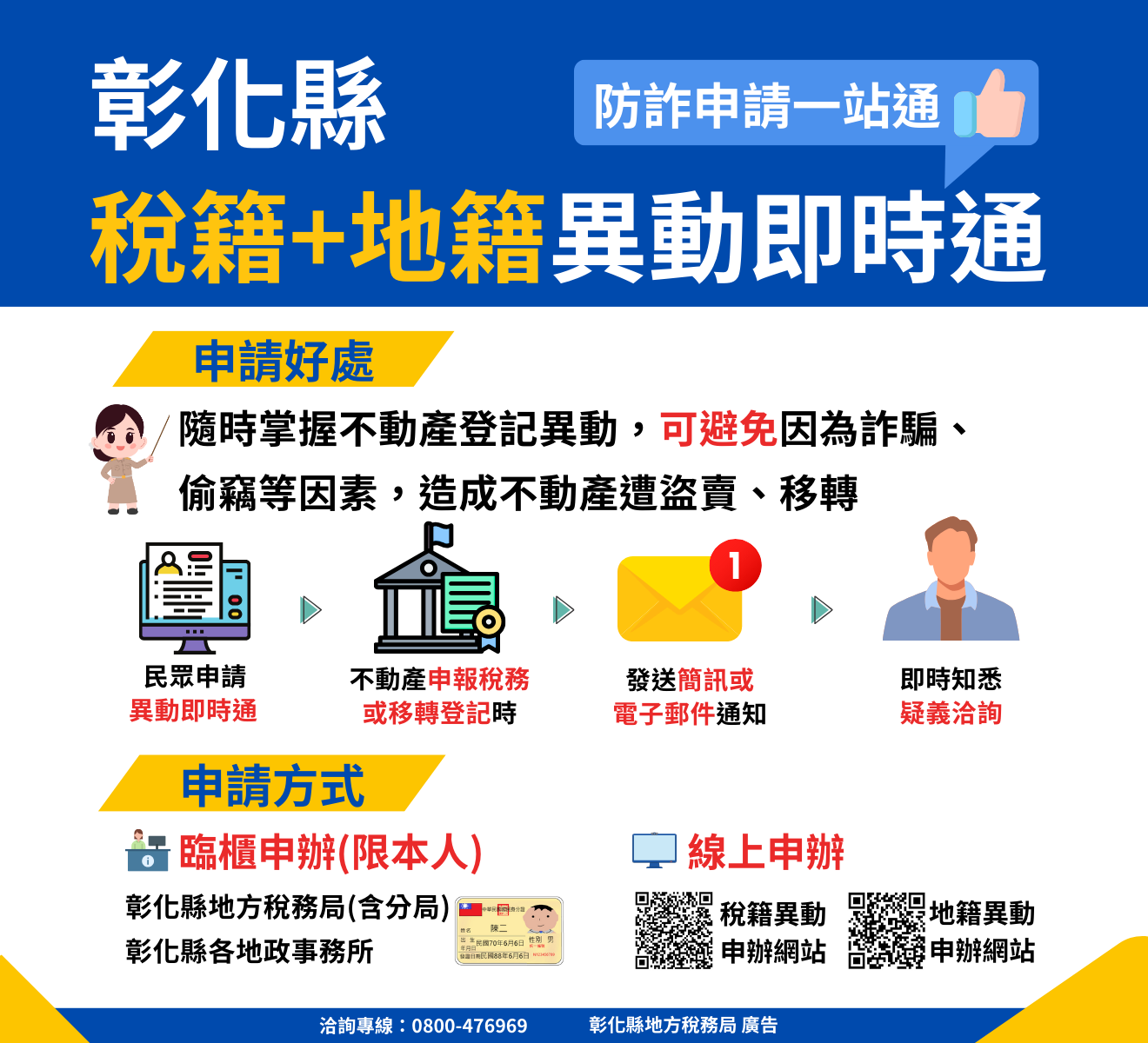 彰化縣政府為強化不動產交易安全及簡化民眾申請流程,彰化縣地方稅務局攜手地政機關合作,正式推出「稅籍異動即時通」與「地籍異動即時通」一站式整合申請服務,提供民眾更完整即時的不動產異動通知機制。