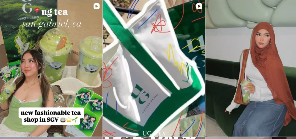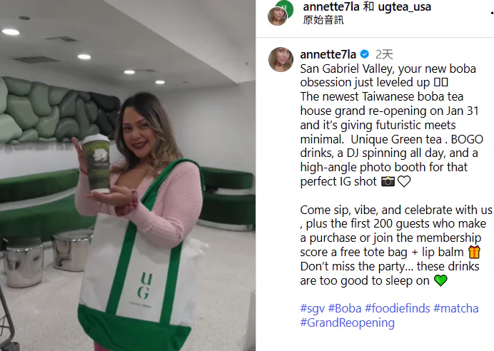 UG品牌以次世代茶飲概念進軍美國,主打低糖植物性飲品,結合台灣茶文化與創新抹茶口味,推出「下一層抹茶拿鐵」與「山茶花烏龍奶茶」等特色產品。重開幕當日更祭出買一送一優惠,前200名顧客加入會員即贈送UG潤唇膏與托特包,並設置Instagram打卡拍照亭,成功創造話題聲量。有多位美國網紅在社群平台狂推UG,「像奶茶版的Gentle Monster」,還有深綠色調的沉浸式空間設計與層次分明的飲品視覺等都具特色,內容獲網友迴響,在洛杉磯626地區引發熱議。