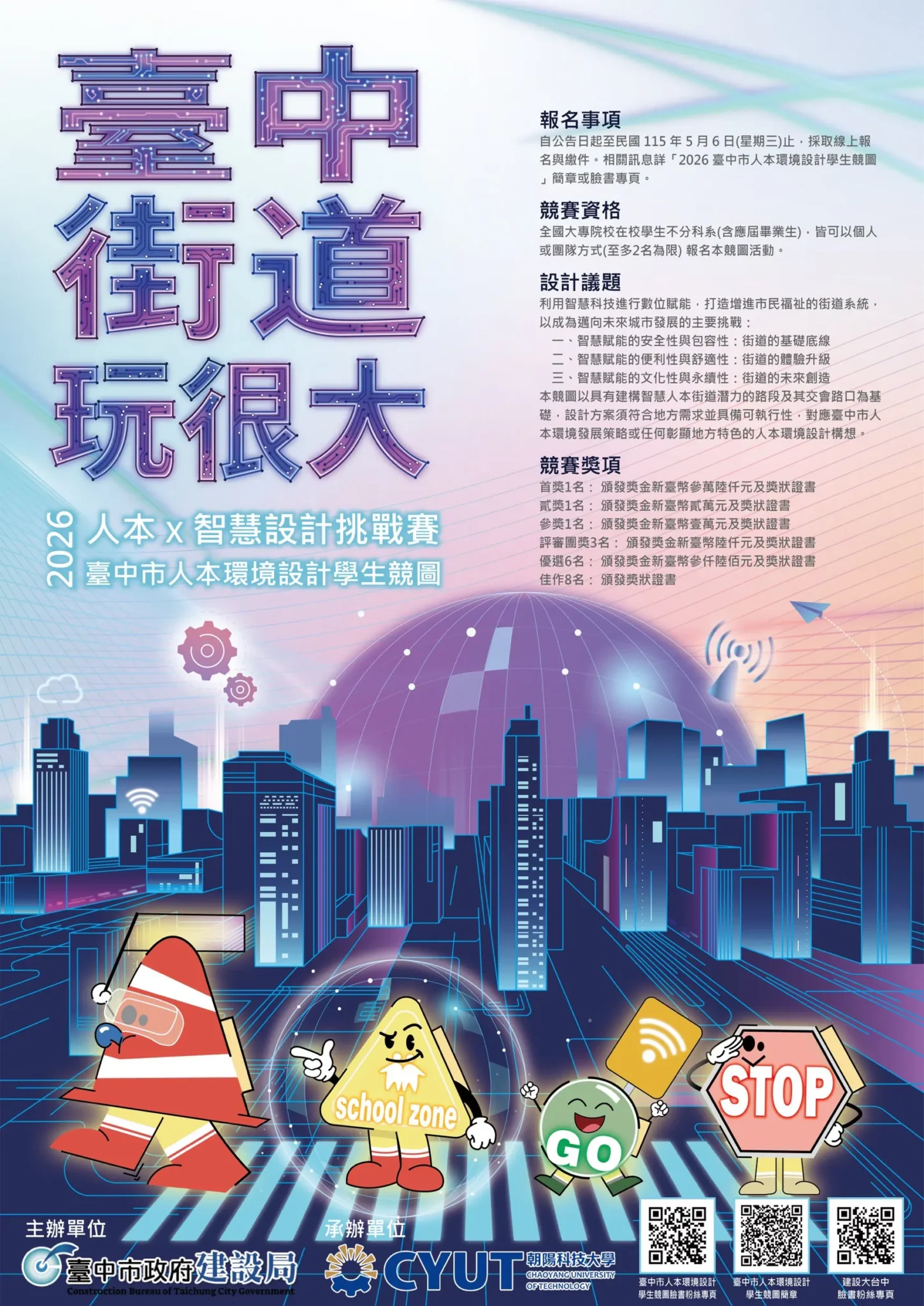 活動即日起至5月6日受理投稿,相關資訊請至「2026台中市人本環境競圖」臉書專頁(https://www.facebook.com/taichungpoe)查詢,歡迎全國大專院校學生踴躍參與,共同為台中街道勾勒兼具溫度與智慧的未來樣貌。