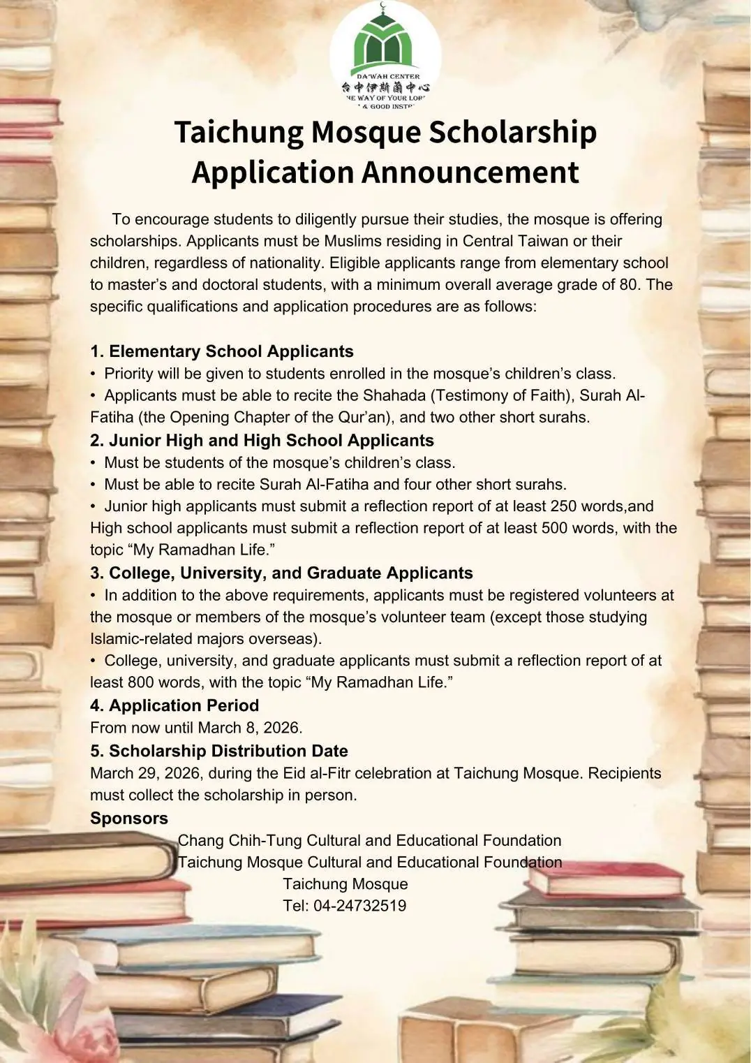 為推動伊斯蘭教育,鼓勵學生學習宗教知識,財團法人台中伊斯蘭清真寺一年一度的獎助學金即起開放申請,今年共有小學、國高中與大專院校及以上三類申請者,申請日期為即日起至2026年3月8日止,請符合資格的學生踴躍申請。
