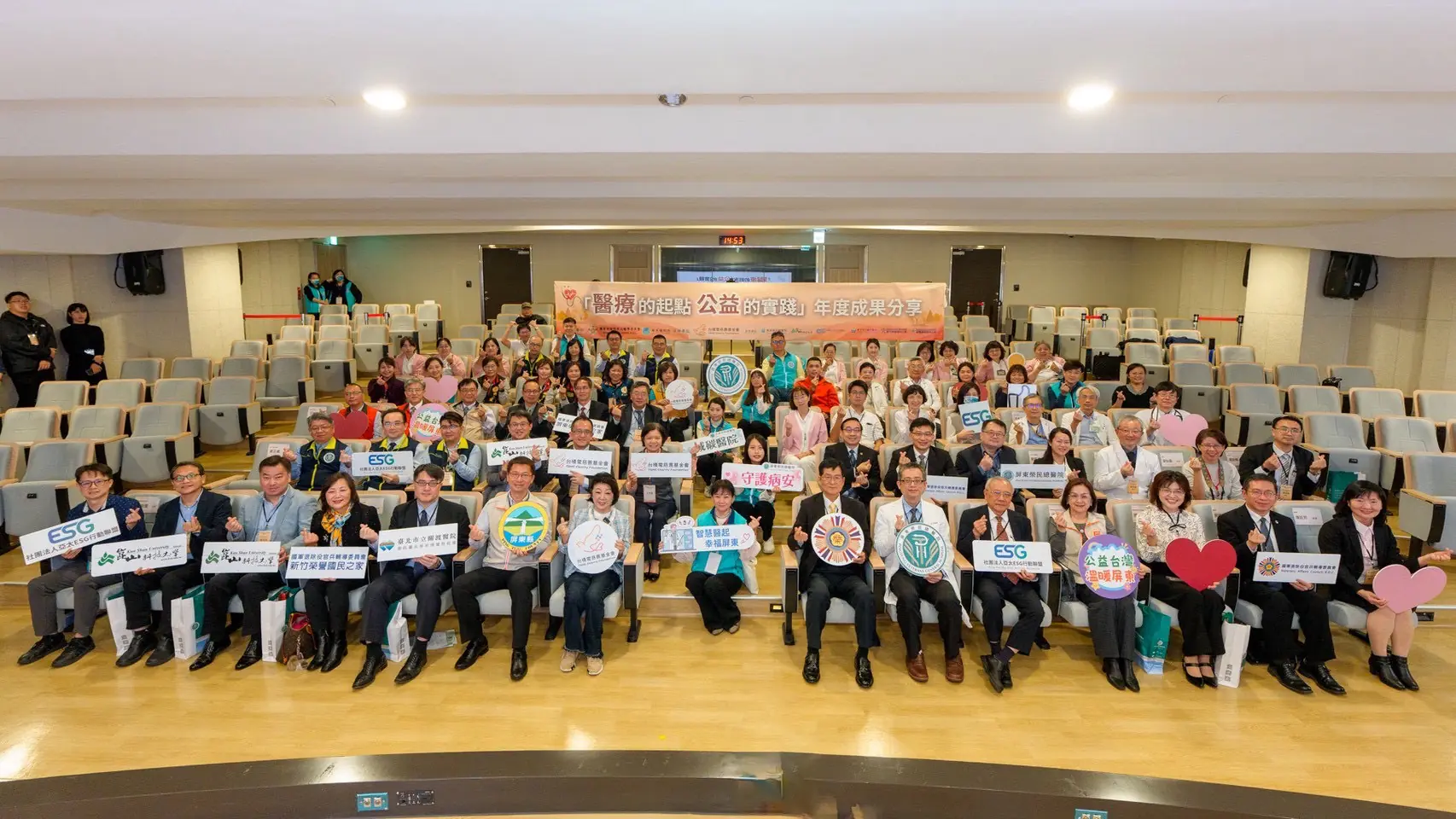 活動最後的大合影象徵著跨界合作的成果。醫院、榮家、政府、基金會、志工與學界共同站在舞台上,象徵「健康長壽三角策略」的核心精神只有社會力量一起投入,才能讓長者的生活更好。