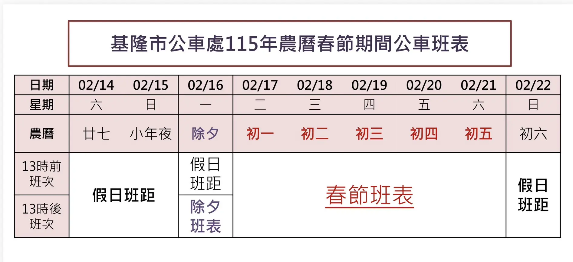今(115)年春節假期自2月14日至2月22日共計9天,為滿足民眾乘車及兼顧駕駛長返鄉過節需求,基隆市公車處所營57條公車路線將調整營運模式,2月14日(農曆廿七)至2月16日(除夕)13時前,以假日班距營運;2月16日(除夕)13時至24時,依除夕班表行駛且夜間公車停駛;2月17日至21日(初一至初五),依春節班表營駛,並於2月22日(初六)起恢復原服務水準。