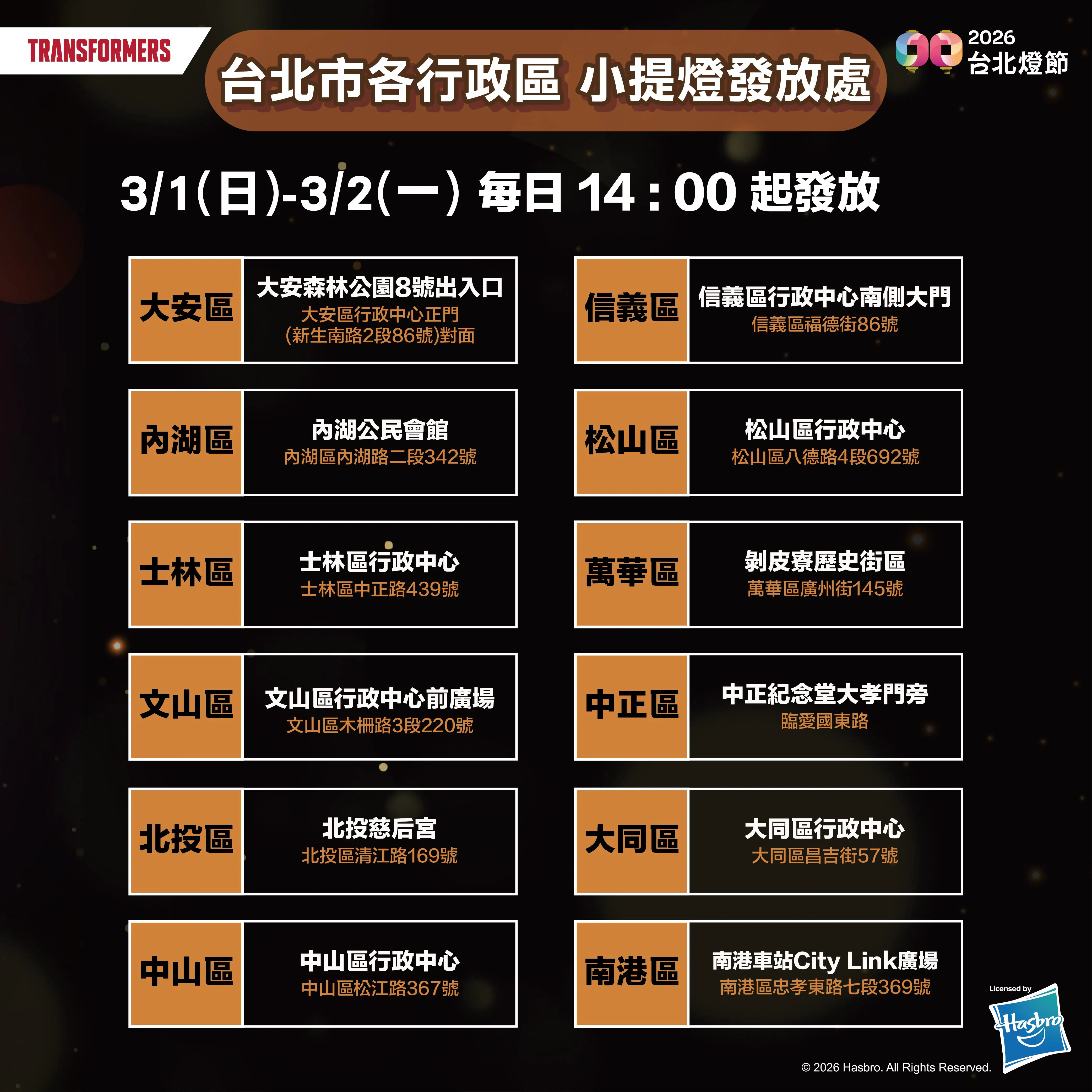 「2026台北燈節」驚喜再升級!於2月25日起至3月15日的台北燈節花博展區,首度攜手全球知名IP「變形金剛」,推出科技感十足、話題滿滿的限量「柯博文」小提燈,設計呼應變形金剛的機械風格與城市未來感,造型吸睛、外型亮眼,兼具收藏價值與互動樂趣。將於3⽉1⽇⾄3⽇於花博展區及⻄⾨展區開放⺠眾限量領取,並於3⽉1⽇⾄2⽇同步於臺北市各⾏政區指定地點發放,邀請⼤⼩朋友⼀同提燈賞燈、拍照打卡,讓燈節夜晚充滿更多歡樂,留下難忘回憶。