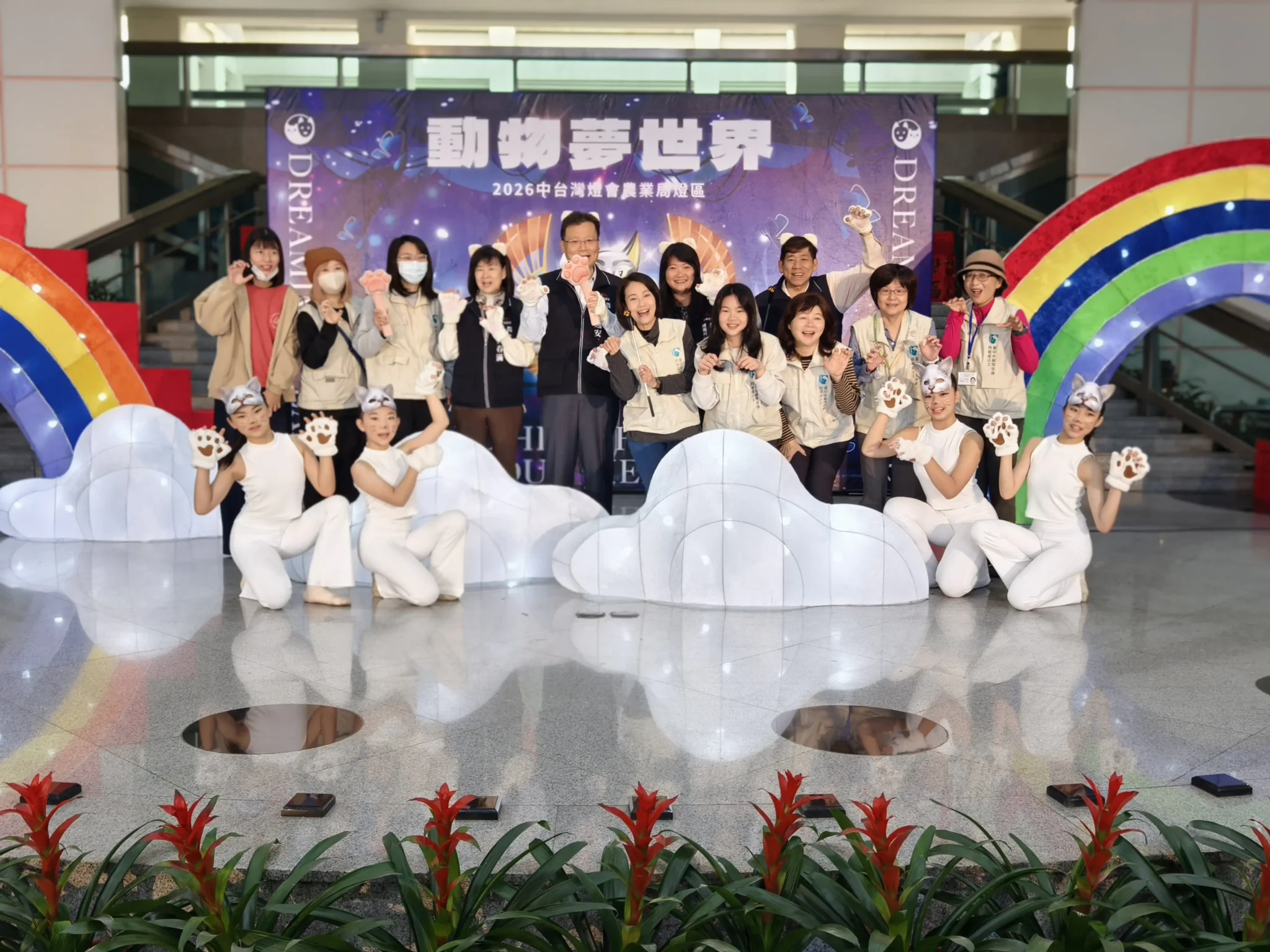 動保處表示,此次記者會特別安排吸睛開場表演,由台中市如玲舞蹈表演藝術教育學院帶來「小白貓主題創意舞蹈」,以活潑童趣的舞步揭開「動物夢世界」奇幻序幕,呼應燈區以小白貓「喵喵」為主角的設定,讓現場觀眾們感受燈區的活潑童趣的氛圍與故事魅力。「動物夢世界」燈區邀請民眾跟隨主角「喵喵」踏入神秘通道,在夢境裡逐步認識野生動物面臨的生存危機、飼養寵物的飼主責任等,在旅途中看見人與動物和諧共處的美好,提升民眾對動物福利的認知。