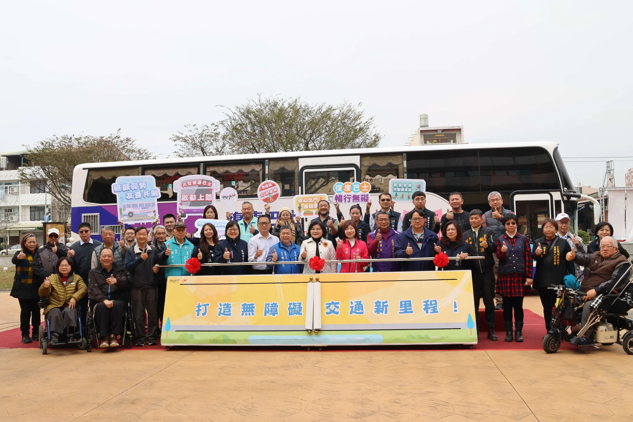 今日復康巴士啟用活動,有縣長張麗善、社會處長林文志、議員黃美瑤、雲林縣脊髓損傷者協會理事長黃傳佑、雲林縣復健青年協進會理事長林淑英、雲林縣聲暉協進會理事長張竹王、雲林縣啟智協會理事長翁建安、雲林縣小天使發展協會理事長林甘、張為忠總幹事、雲林縣聽語障福利協進會理事長蕭玉敏、詹俊輝總幹事、雲林縣北港身心障礙者福利協會社工劉桂秀、雲林縣身心障礙福利協會理事長百漾·馬地克拉安、雲林縣視障重建福利協進會秘書李佼凌、雲林縣盲人福利協進會理事長廖慶銘、雲林縣身心照護協會常務監事呂永昌、雲林縣愛無礙協會理事長楊光遠、華聖家園院長劉振旺、雲林縣虎尾身心障礙協會理事長張文宏、雲林縣養護中心主任陳衣婕、雲林縣身心靈關懷協會陳韋誠前理事長、雲林教養院院長劉淑喜、雲林縣特殊教育學校校長林維靖、雲林縣輔助科技服務協會主任黄劭瑋、永宜遊覽汽車有限公司副理蕭汶淇、和泰巴士銷售股份有限公司總經理陳立瑋,另議員蔡東富議員夫人洪惠玲、王又民、陳永修、賴明源、陳芳盈亦派員出席,共襄盛舉。