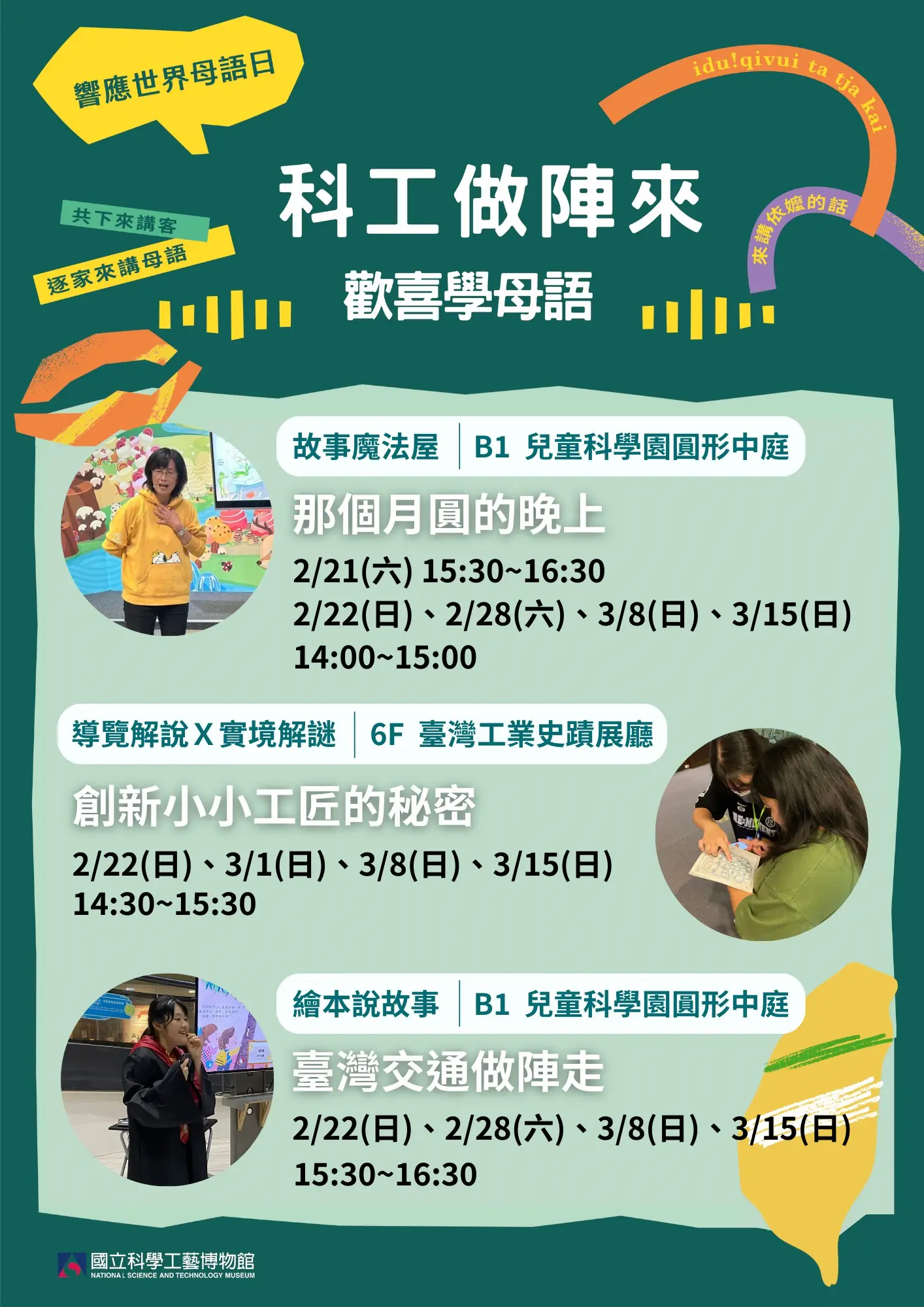 聯合國教科文組織(UNESCO)於1999年倡議將每年2月21日訂為「國際母語日」,自2000年起全球慶祝,強調母語與文化多樣性對可持續社會的重要性。國立科學工藝博物館(科工館)秉持「啟發探索、創新思維、追求永續」的使命,致力將科普教育與文化傳承結合,這次也響應母語日,策劃2至3月的「科工做陣來‧歡喜學母語」系列活動,透過本土語言導覽、繪本導讀與手作體驗,將科學知識與臺灣文化傳承緊密結合,共同營造友善的母語學習環境,歡迎親子家庭一同參與,認識臺灣台語的獨特文化價值。
