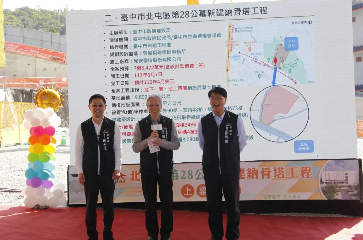 台中市長盧秀燕重視民眾對殯葬設施的實際需求,近年持續推動殯葬服務建設。市府建設局與民政局跨局處合作,斥資7億5,422萬元推動「北屯區第28公墓新建納骨塔工程」,並於今(11)日舉行上梁典禮,由建設局副局長陳永欣及民政局副局長彭岑凱共同主持,工程預計於116年4月完工,未來將打造兼具人文關懷與安寧氛圍的空間,實踐「來者以遊、生者以慰、逝者以安」理念,完善地方治喪需求。