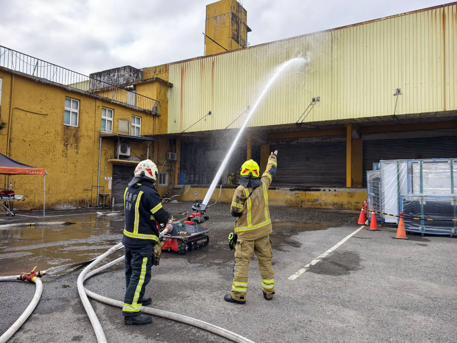 演練中動員救災機器人實地進行射水作業。