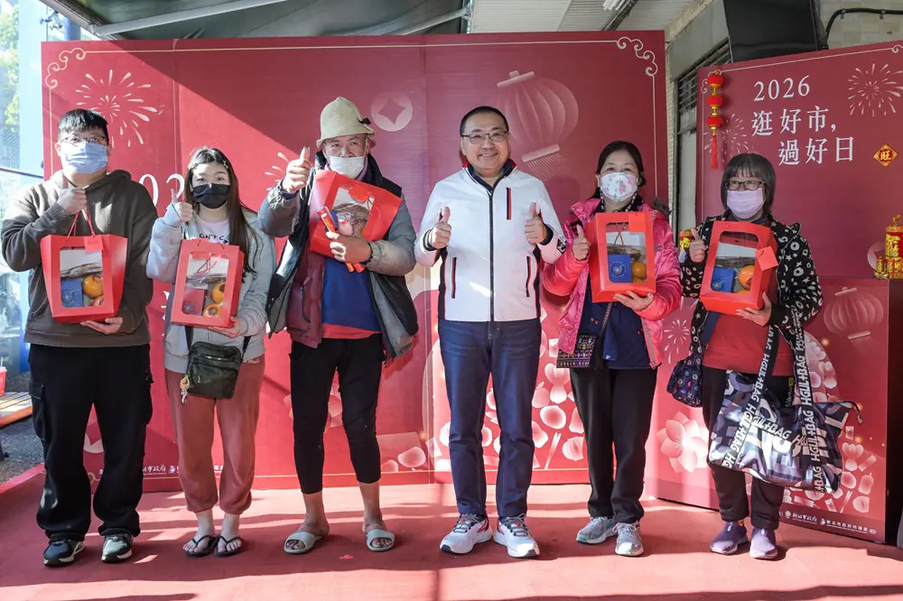 侯友宜加碼抽5位坊寮市場年節禮「迎春好禮包」。(新北市經發局提供)