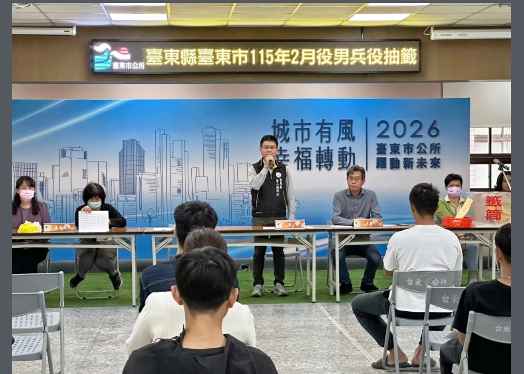 台東市公所於今(24)日上午舉行役男兵種抽籤作業,由市長陳銘風親自主持。現場共有26位役男及家屬到場參與,過程在公正、公開的程序下順利完成。軍人服務站及國軍人才招募中心亦派員到場,針對福利權益及生涯規劃進行宣導。