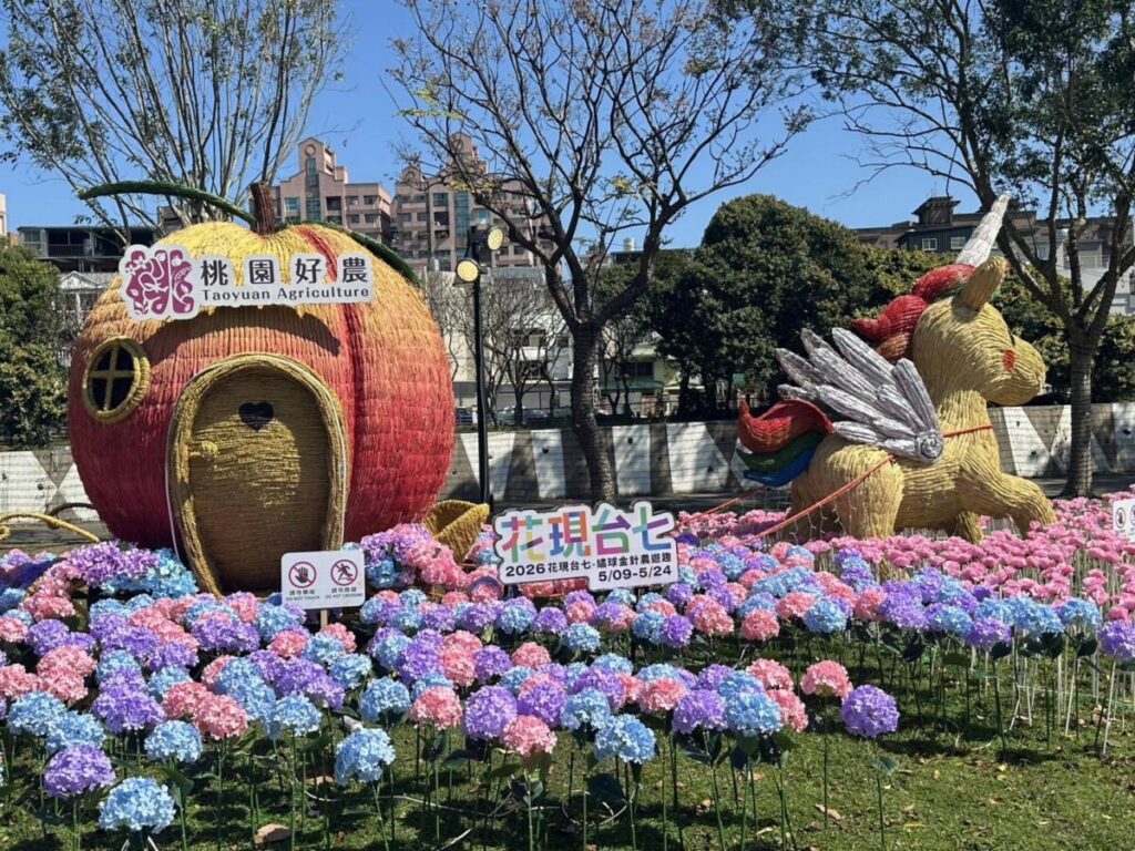 農業局主題燈區結合各種巧思,整體燈區布置還有金黃稻穗,象徵桃園魚米之鄉特色,此外也融入彩色海芋、繡球花海等桃園特色活動元素,預約市民朋友一起到3月27日起登場的「彩色海芋季」、5月9日起登場的「花現台七-繡球金針農遊趣」同樂。