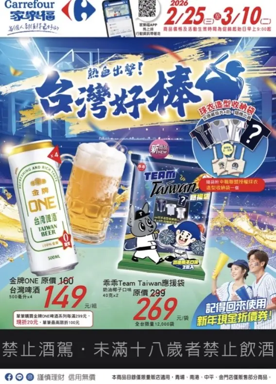 再一波金色補給泉水,加碼家樂福會員專屬「家樂福x Team Taiwan聯名啤酒卡」會員價只要99元(市價199元),三款限量卡面隨機販售,2月28日~3月20日啤酒卡限量販售,3月31日前不限使用次數,購買啤酒結帳出示啤酒卡享9折優惠,包含檔期推薦啤酒也適用。(此啤酒卡不適用大宗採購,且不含:出清、預購、特別促銷活動 商品、臺灣菸酒公賣局商品)。