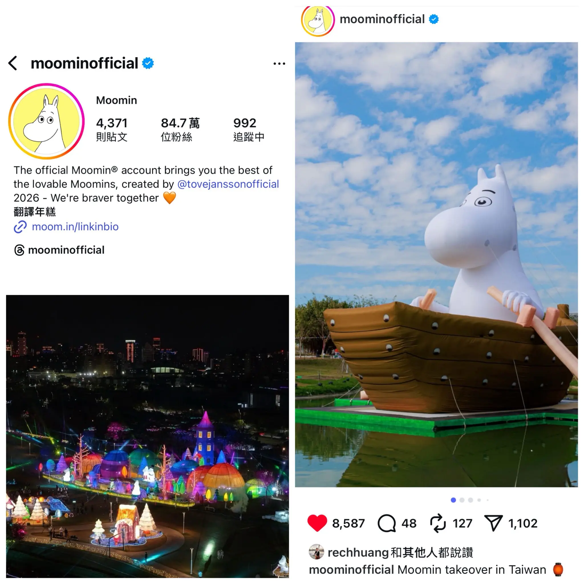 陳局長進一步指出,姆明一族(The Moomins)所傳遞的「家庭、冒險、純真」精神,在燈會期間療癒了無數人的心,Moomin全球官方FB、IG也專文分享了姆明一族(The Moomins)登入台中中央公園,在極光下划船、露營的療癒魅力。燈會展期倒數計時,歡迎所有曾在此留下歡笑的民眾都能攜家帶眷,提著點亮的「姆明小提燈」再次重遊,不僅是為了向姆明一族說再見,更是要謝謝它們帶來台中的溫暖感動,讓大家帶著這份幸福感「MOOMIN ON」。