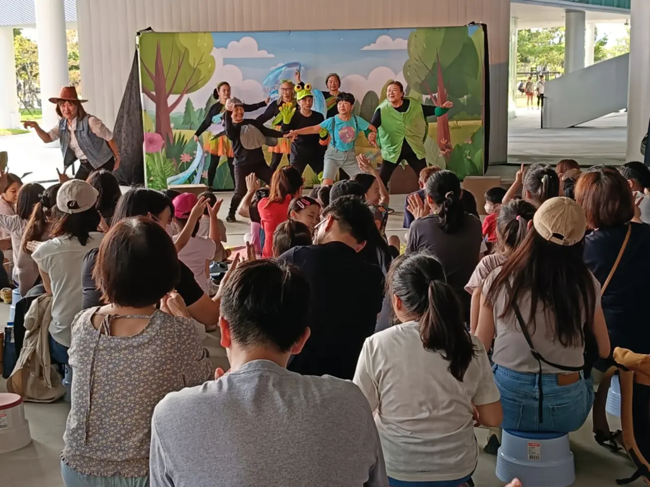 故事劇團志工在綠美圖遮蔭廣場表演,吸引許多民眾前來觀賞