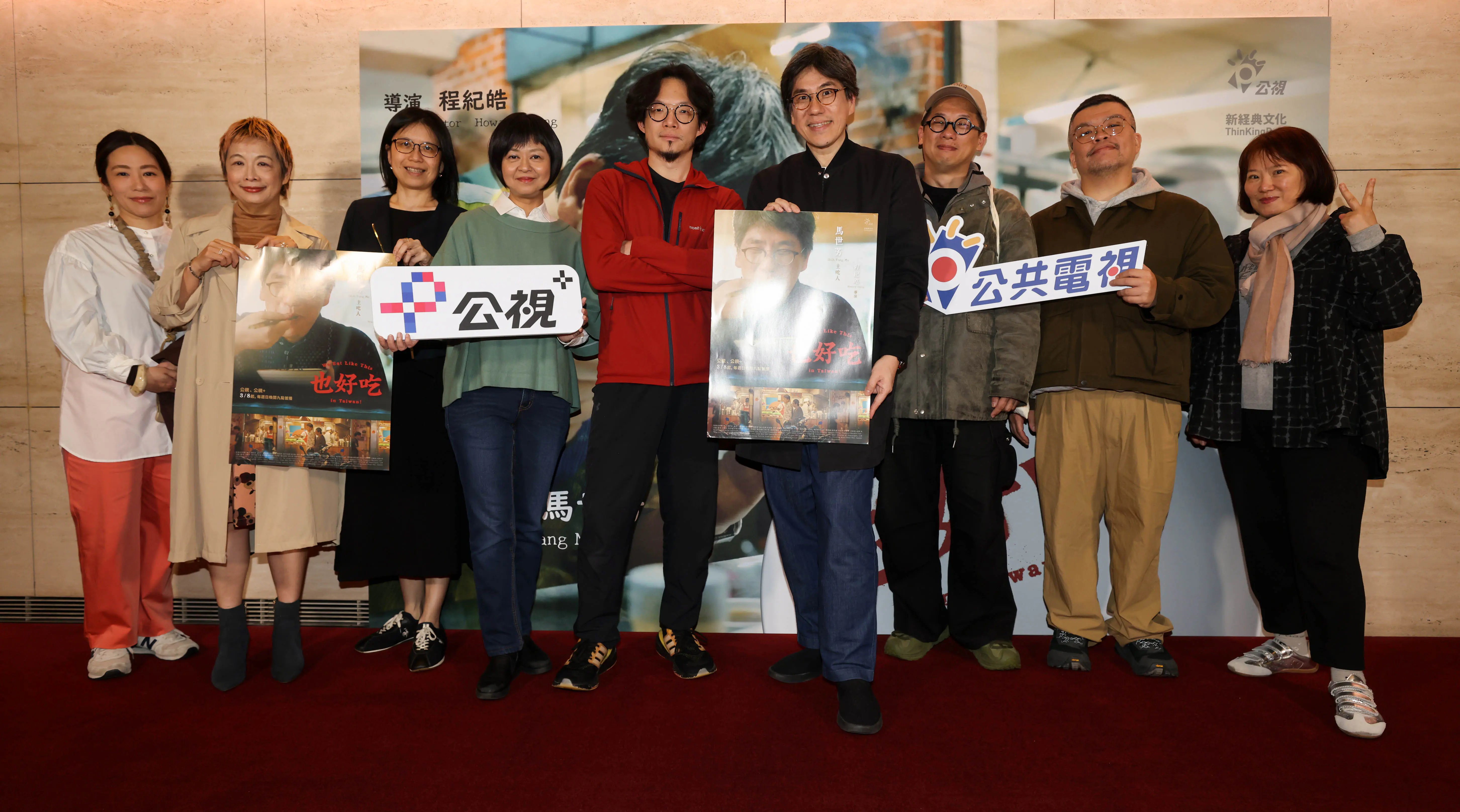 公視《也好吃》主創團隊及節目來賓熱情出席特映會,(由左至右)作家近藤弥生子、我愛你學田負責人劉昭儀、作家比才、作家葉怡蘭、導演程紀皓、主持人馬世芳、音樂創作者柯智豪、音樂創作者迪拉(張逸聖)、作家韓良憶 照片提供:公共電視