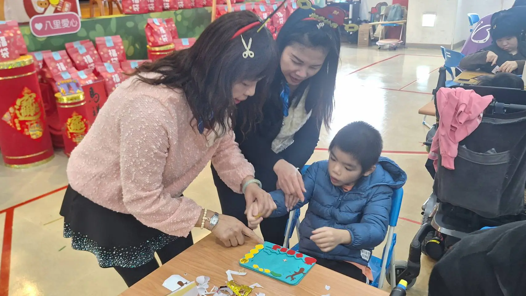 院生阿忠(右)和志工惠真(左1)與秋香(中)一起創作相框DIY。(新北市社會局提供)