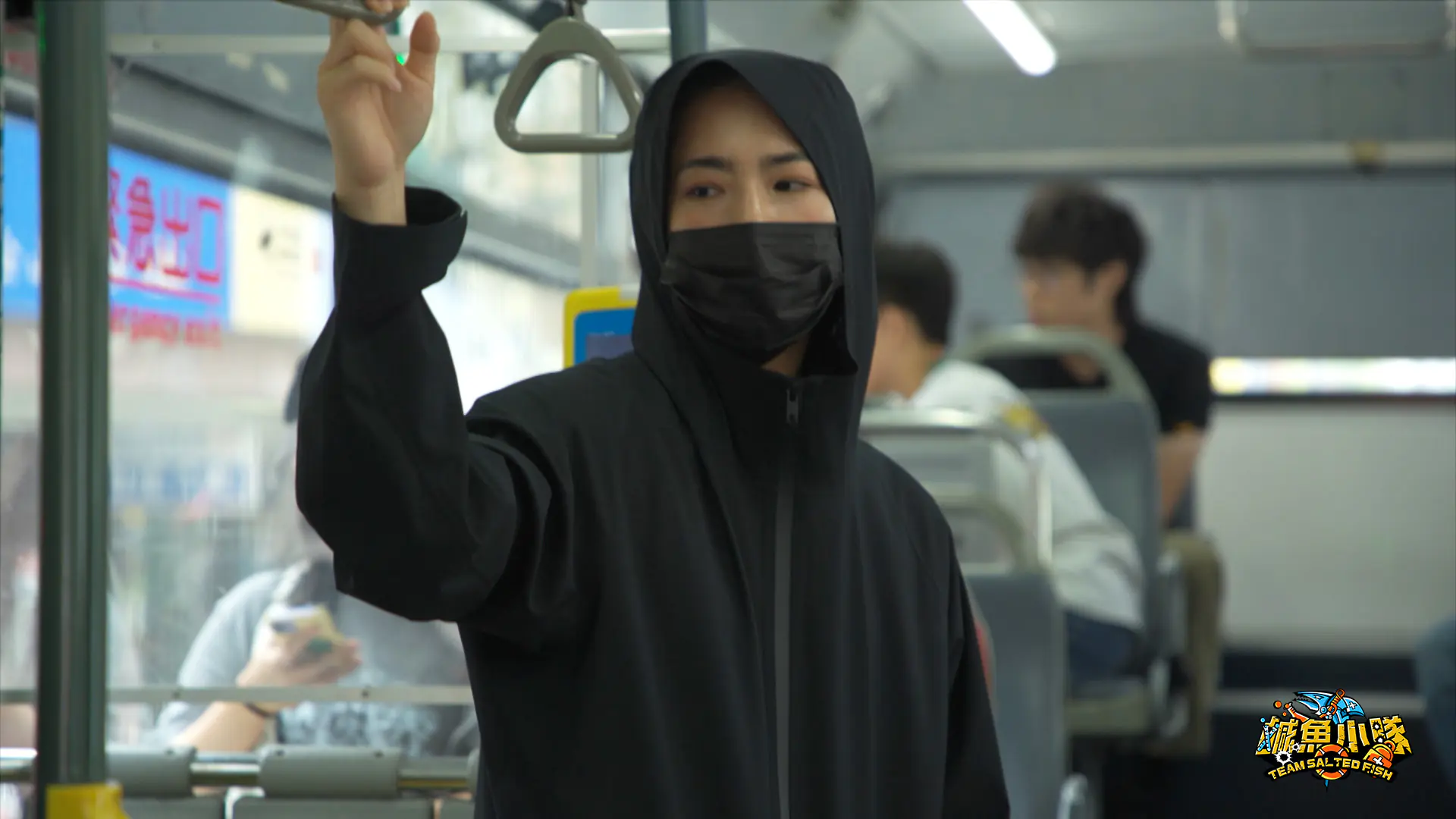 《鹹魚小隊》第二季「隨機傷人」篇,宇宙在公車內飾演行為異常的乘客。 圖片提供:公視