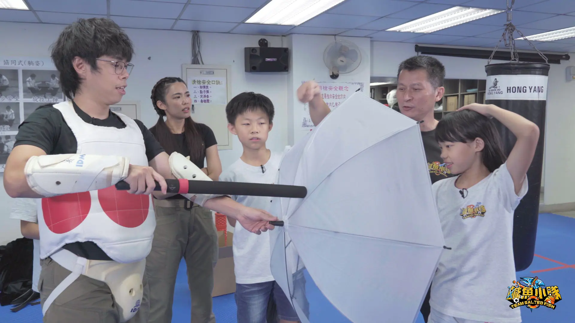 主持人宇宙(左二)胡子(左一)及小隊員在「鹹魚訓練班」練習遇到無差別攻擊該如何防身。  圖片提供:公視