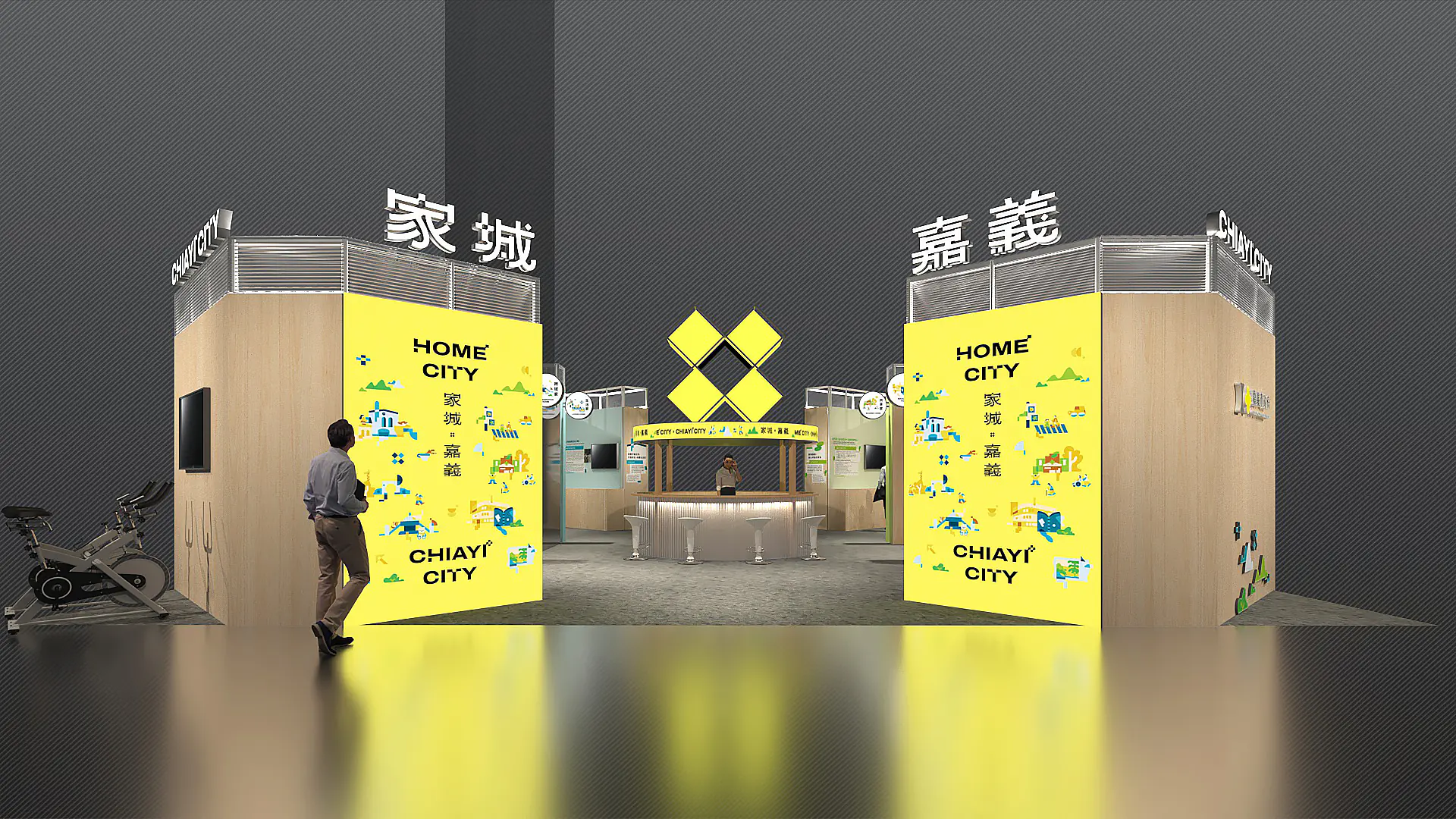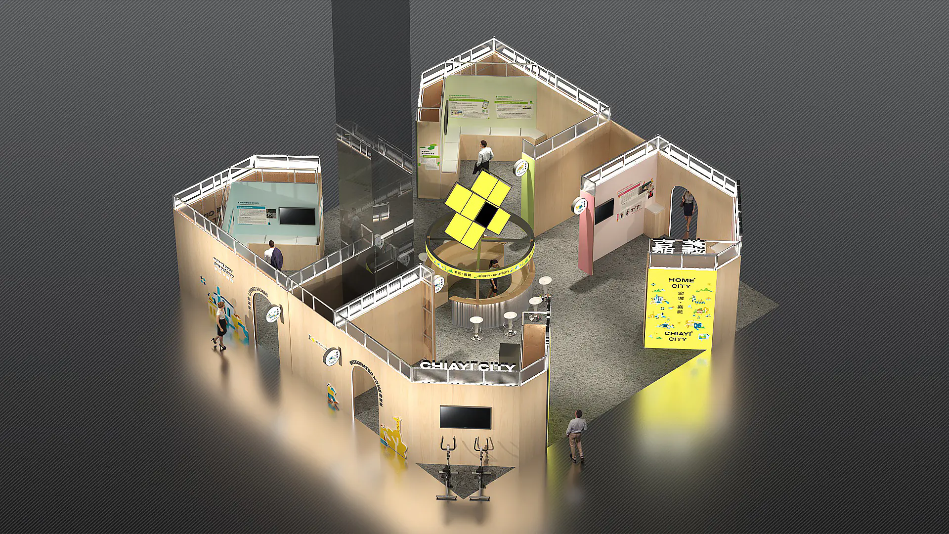 策展人潘岳麟以「家城×嘉義」為主題,強調「家」是城市最溫柔堅實的象徵。展館設計靈感源自「圓環噴水池」與「木都文化」,中心圓環象徵城市脈動的核心節點,串聯科技與資源的流動。四大展區環繞中心展開,透過空間敘事將嘉義市推動智慧治理的理念,轉譯為可以被感受、參與且充滿想像的幸福城市。