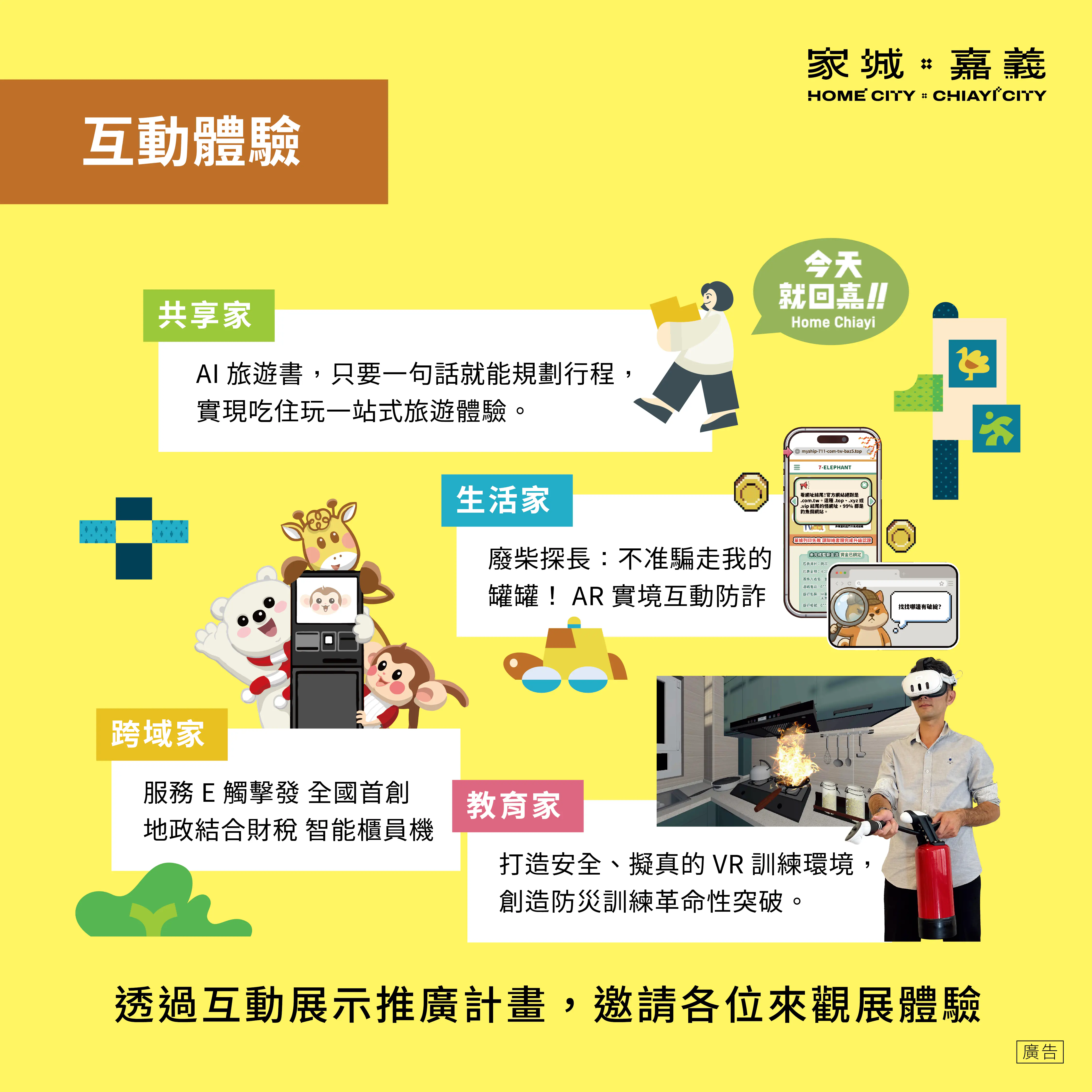 為了讓智慧治理的成果觸手可及,嘉義市政府在展館內規劃多元互動體驗,讓科技從抽象概念轉化為身歷其境的感受。觀眾在「教育家」展區可戴上VR設備進入擬真場域,體驗創新防災訓練的臨場感;「共享家」展區則邀請民眾與AI展開對話,量身打造專屬的嘉義旅遊行程,享受吃、住、玩一站式智慧導覽。此外,走進「跨域家」展區即可親手操作智能櫃員機,體驗整合型公共服務帶來的便利與效率;而「生活家」展區則結合AR實境技術,將防詐宣導轉化為趣味互動,讓民眾在寓教於樂中提升識詐能力,共同守護城市生活的安全。