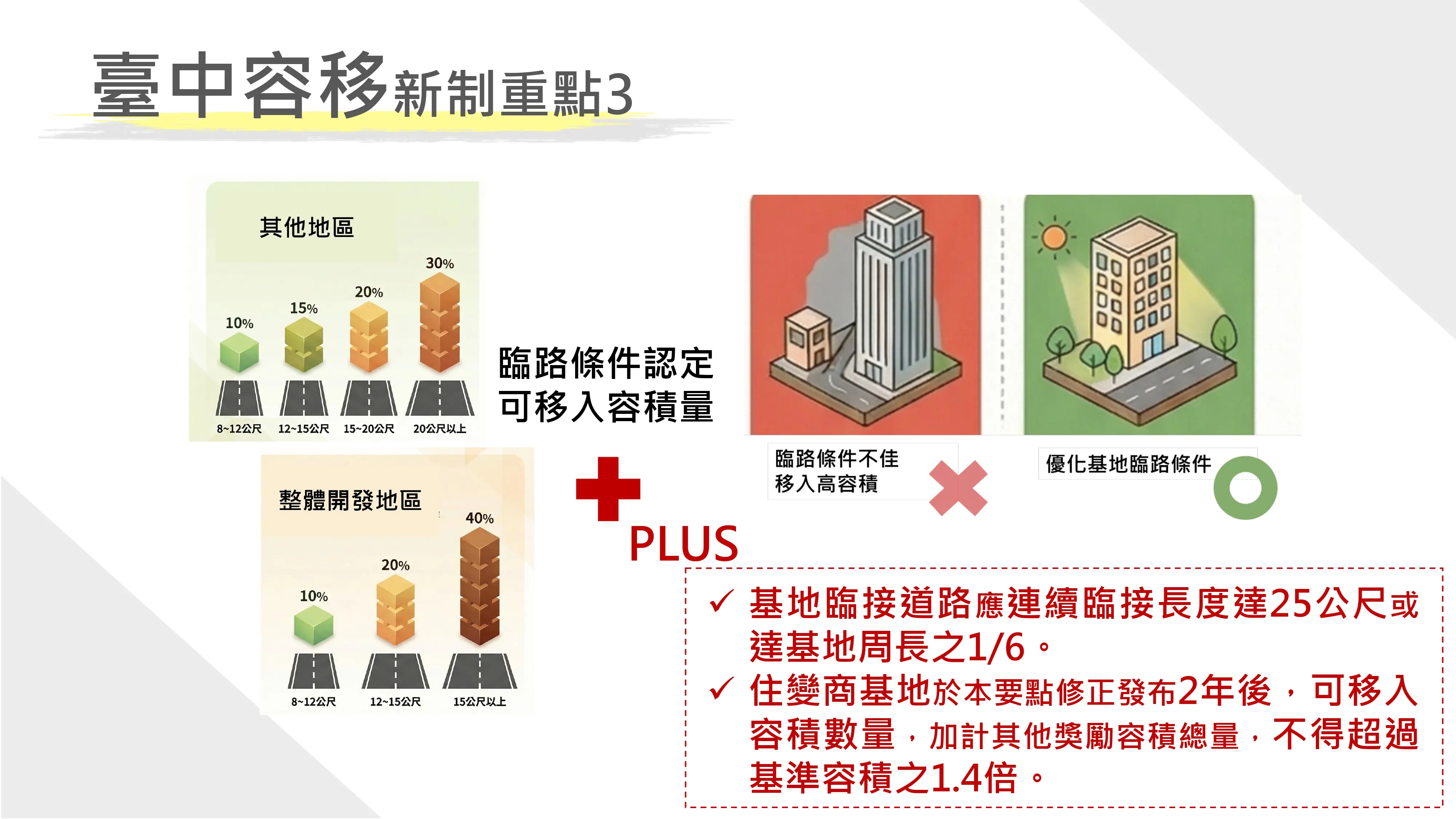 在提供建築規劃彈性的同時,市府對於環境品質的提升,也是此次修法重點。新制針對接受基地臨接道路的長度及其可移入量體部分進行更嚴格管控,尤其規範住變商基地可移入量上限,於發布實施2年後,加計其他獎勵容積總量,不得超過其基準容積之一點四倍。確保容積移入後的地區仍能維持良好的景觀與公共服務水準,防止產生環境壓迫感。