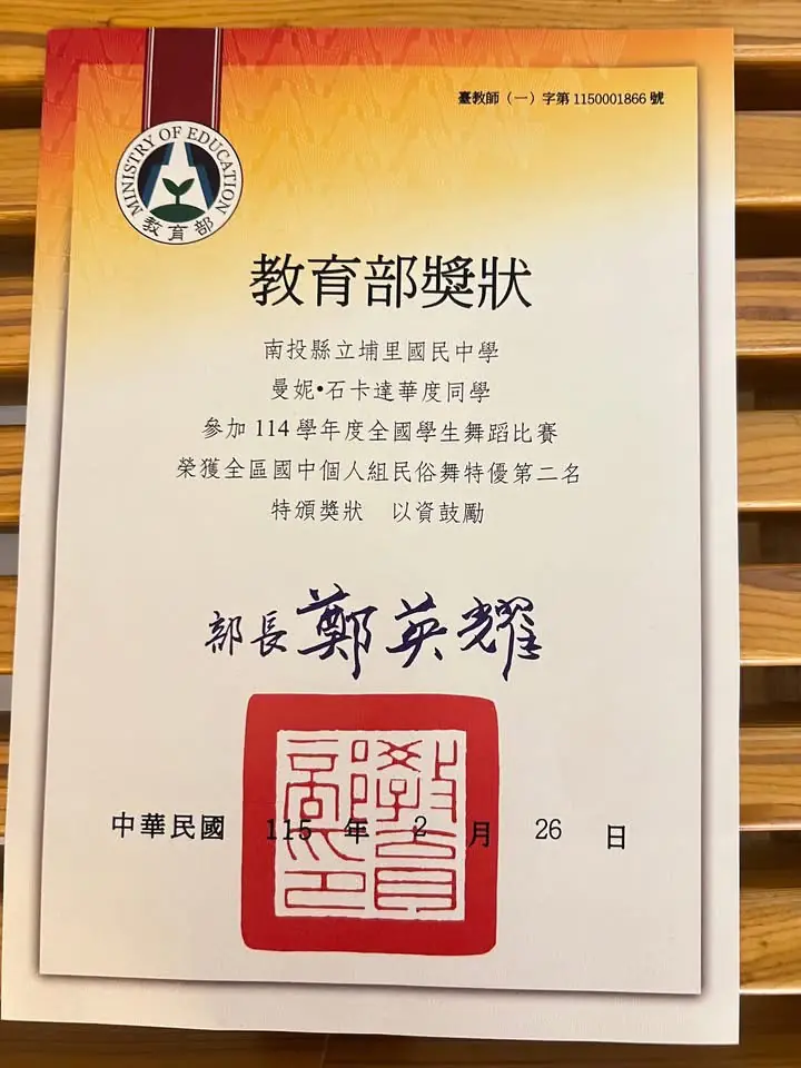 南投縣埔里國中再傳捷報!學生曼妮·石卡達華度參加114學年度全國學生舞蹈比賽決賽,以舞碼「飛花蝶語」脫穎而出,榮獲國中民俗舞個人組特優第二名,成績達90.90分,與第一名同分,表現亮眼,為學校與地方爭光。