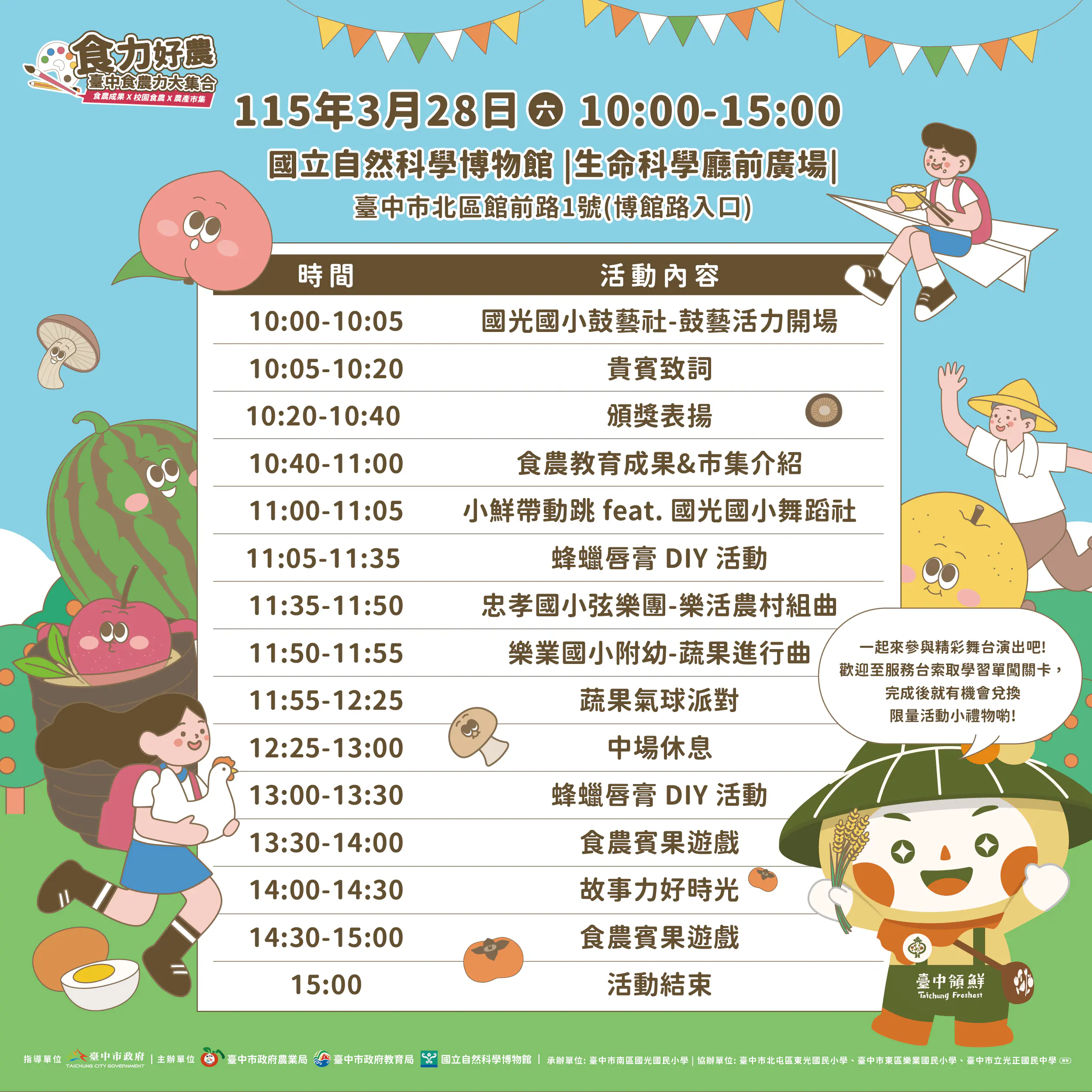為展現台中市豐富多元的食農教育成果並持續推動食農教育,台中市政府農業局、教育局與國立自然科學博物館攜手合作,將於3月28日(星期六)上午10點,在科博館生命科學廳前廣場舉辦「115年中市食農教育成果展暨校園食農教育嘉年華」。