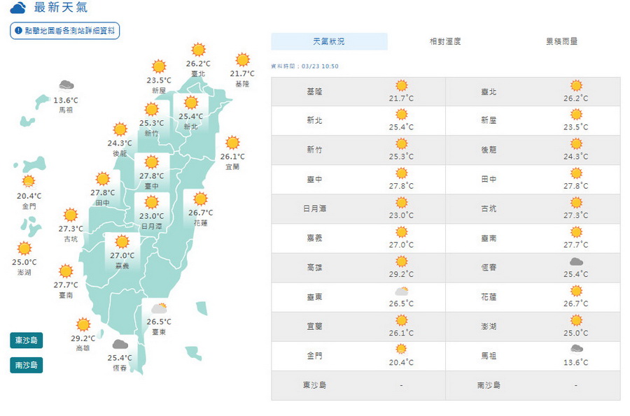 今天3月23日因東北風稍稍增加,基隆北海岸、東北部、東部地區及大臺北山區有局部短暫陣雨,大臺北、東南部、屏東地區及恆春半島有零星短暫陣雨,其他地區及澎湖、金門、馬祖為多雲到晴,午後南部山區有零星短暫陣雨。