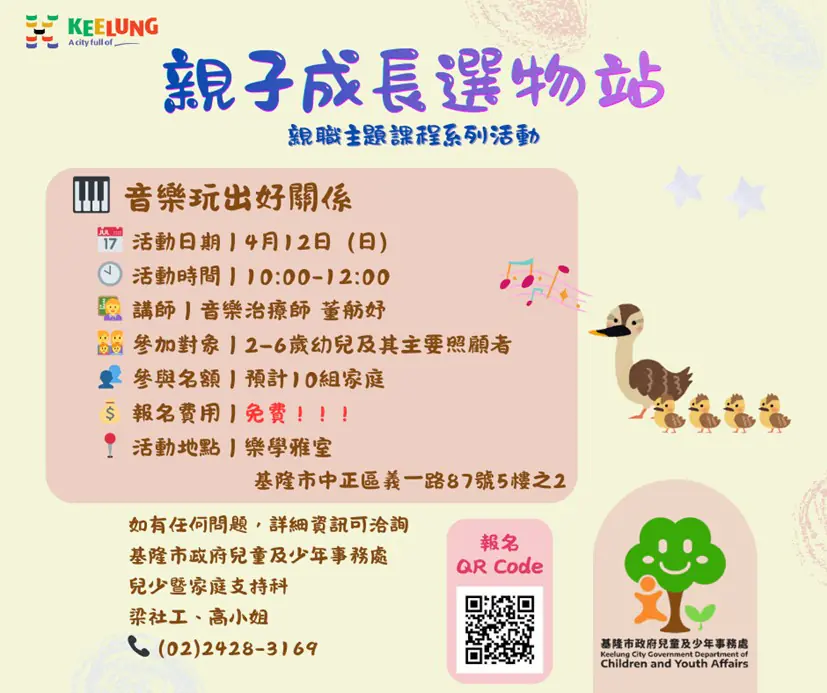 吳雨潔補充,本次「音樂玩出好關係」活動名額有限,歡迎家長踴躍報名參加,一同進入音樂的奇幻世界,為孩子的童年留下美好回憶。欲了解更多活動細節或進行報名,請密切關注「基隆市政府兒童及少年事務處」官方臉書粉絲專頁,掌握第一手育兒資源與活動資訊,讓我們一起陪伴孩子快樂成長!