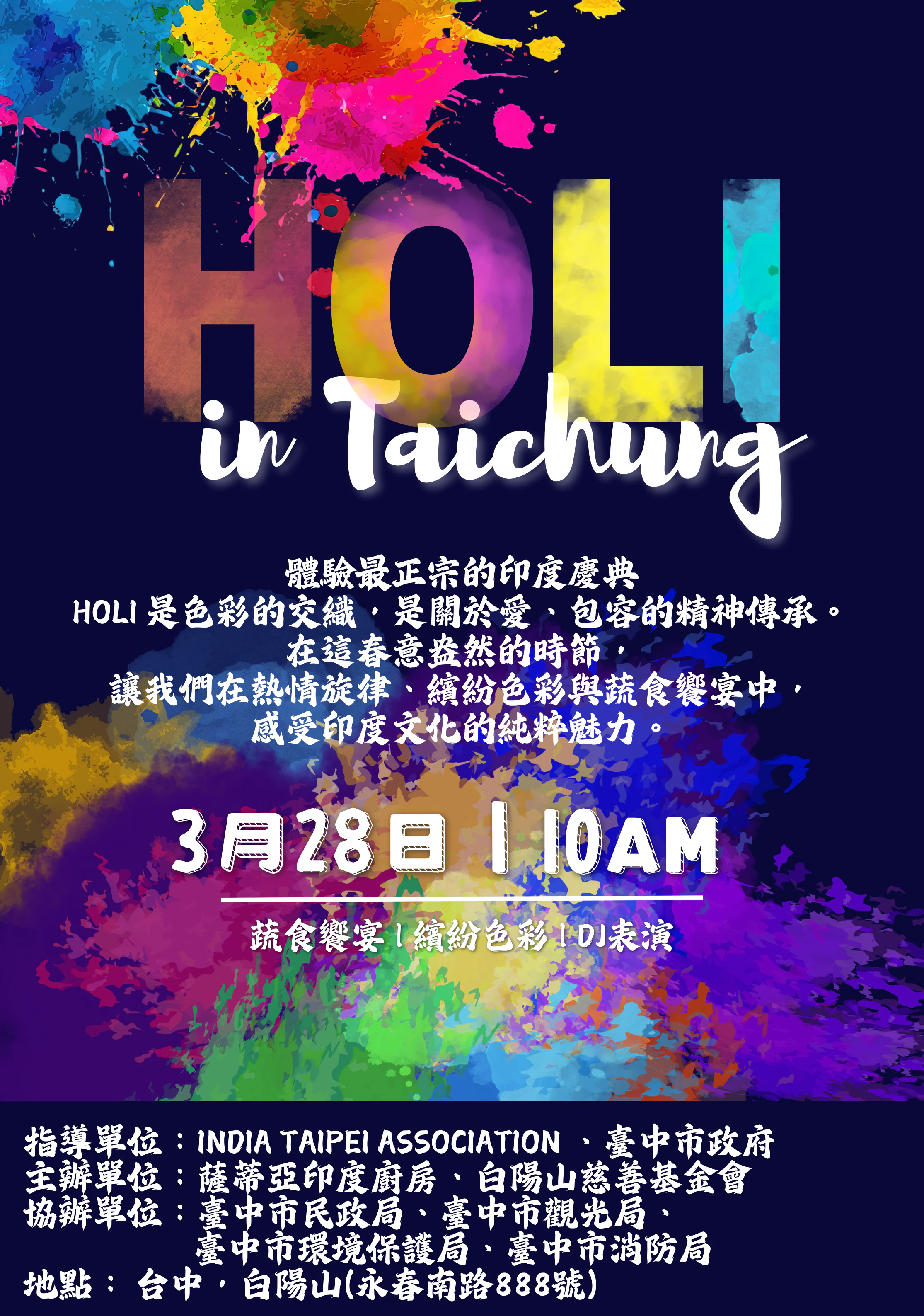 迎接今年最繽紛的Holi派對!由白陽山慈善基金會主辦的「Holi in Taichung 2026-色彩狂歡節」,將於3月28日(星期六)上午10時在南屯區白陽山熱鬧登場。民政局長吳世瑋表示,延續去年首度舉辦即獲廣大回響,今年活動內容再升級,結合彩水水球、寶萊塢音樂、舞蹈演出、異國蔬食及文化體驗等豐富內容,歡迎市民朋友走進白陽山,在春日暖陽與壯麗山景中,感受一場融合視覺、味覺與多元文化魅力的國際節慶盛宴。