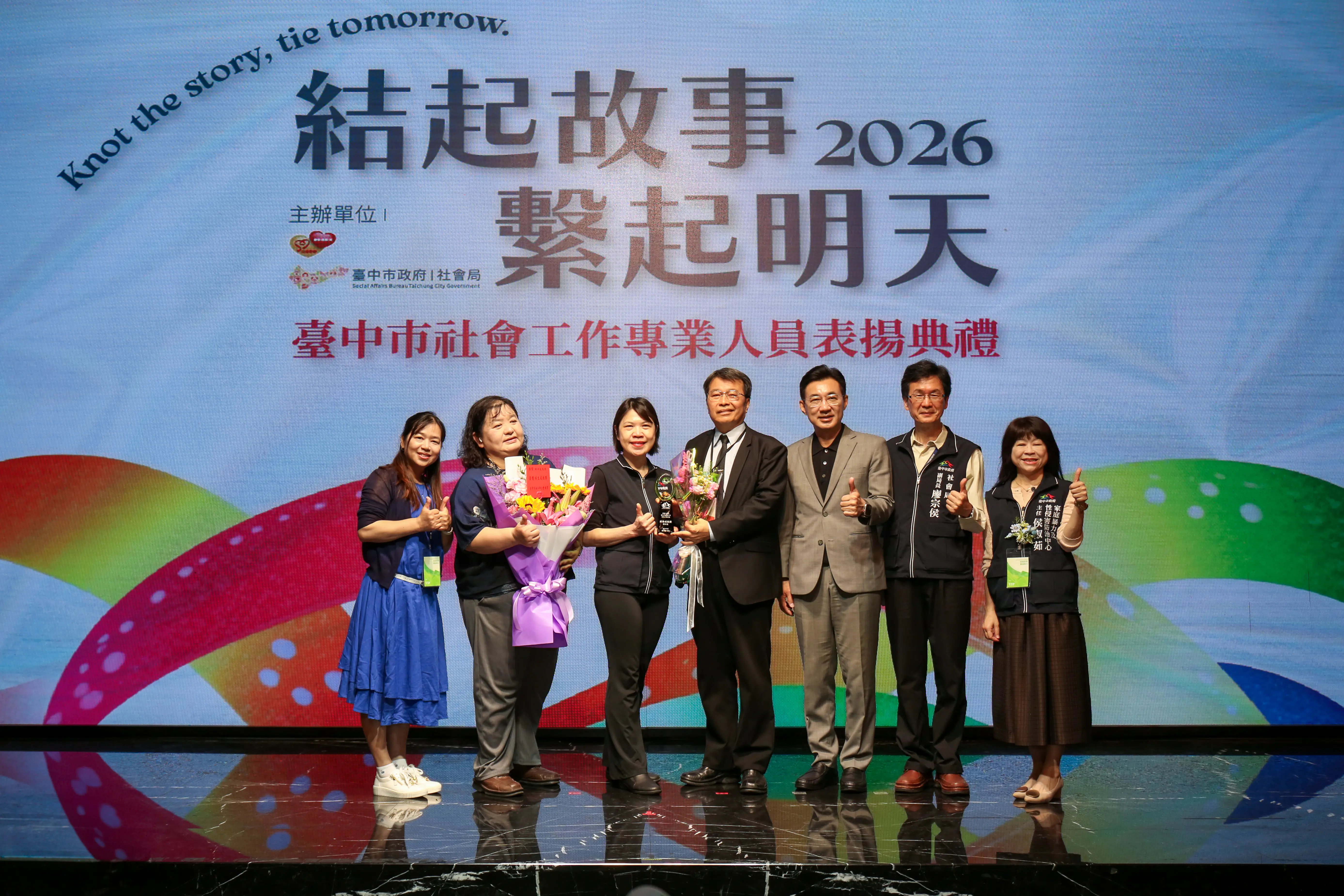 林副局長指出,今年典禮主題為「結起故事,繫起明天」,象徵社工串起交織連結的生命故事,為困境中的家庭帶來方向與希望。為呼應今年主題精神,本次典禮獎座以「結帶」與「交織」為設計概念,透過環繞交織的造型意象,展現社工在不同領域中彼此支持、共同守護社會的力量。典禮開場特別安排沙畫演出,描繪社工的服務點滴,以及陪伴民眾跨越困境的過程。