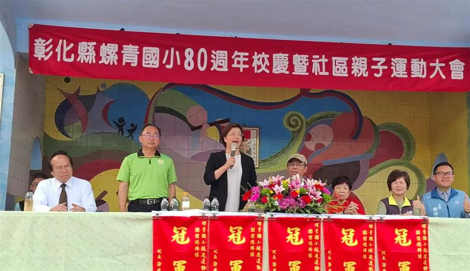 北斗鎮螺青國民小學創校至今邁入第80個年頭,今(28)日上午隆重舉辦「80 週年校慶運動會」,彰化縣長王惠美、北斗鎮長顏宏霖、螺青國小校長許孝麟等人共同為螺青國小慶生。王縣長親自到場為參賽師生加油打氣,並感謝議長謝典霖及所有議員對教育經費的支持,這2年共挹注約2,152萬元改善學校運動場地與教學設施,為孩子打造更優質的學習環境。
