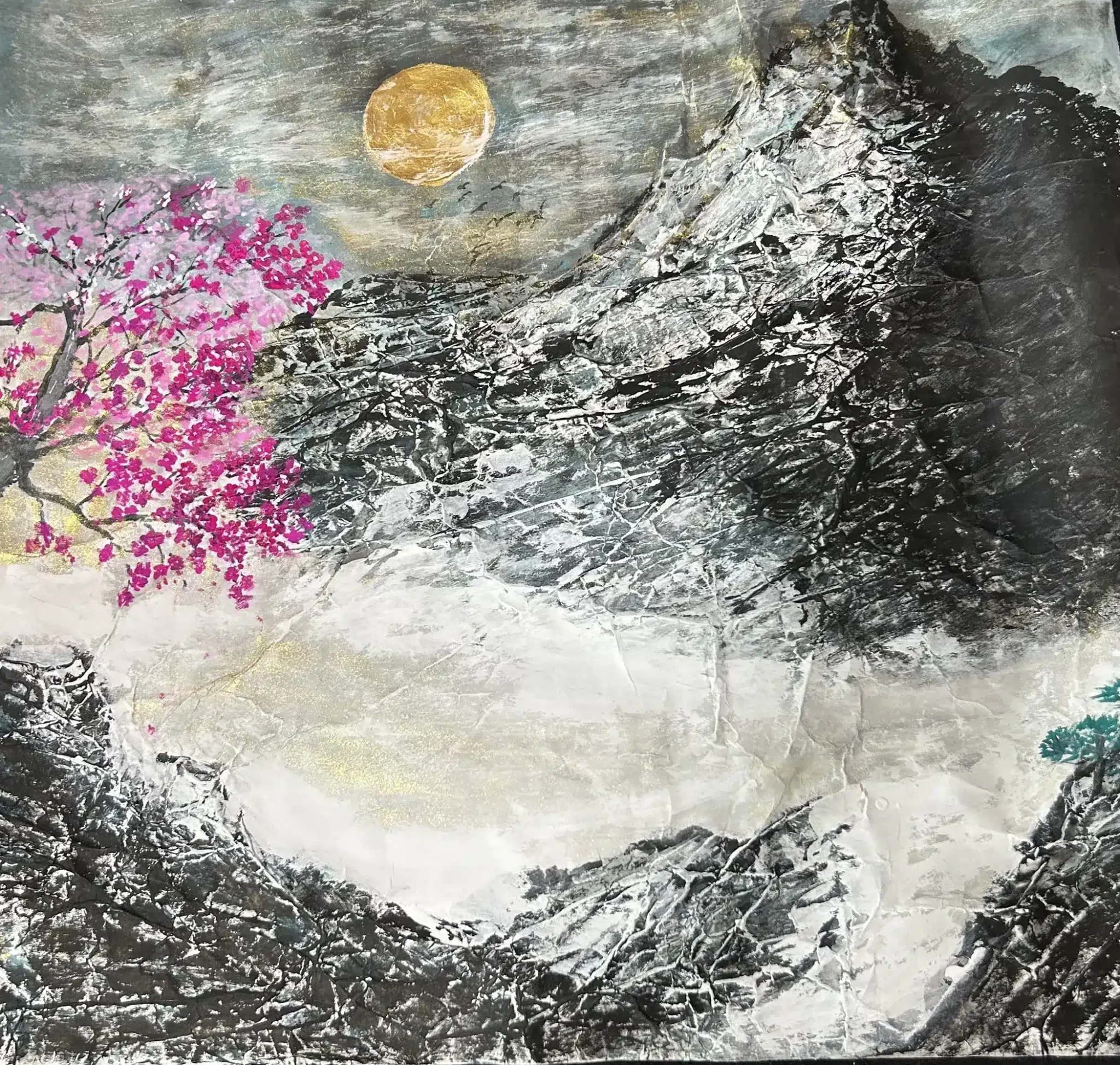 藝展竟心藝苑苑長王佳以老師分享,藝術不僅是形式的創作,更是回歸內在、安定心靈的過程。她的膠彩作品融合書法線條節奏與膠彩色彩層次,並透過霧吹、滴流與拍打等技法,展現自然生命的律動與細膩典雅的畫面質感。此外,包含羅珈瑩、詹彩鳳、許倩怡、黃曼凝、詹珮珊及李鳳珠等多位創作者亦共同參與展出,盼藉此展覽匯聚豐富而多元的正向力量,並傳遞給觀展人。