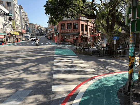 因此,交通局在與在地里長及沿線店家多次溝通協調後,決定縮減車道寬度,在立體停車場出口到老街茄苳樹前路口之間繪設標線型人行道,同時調整既有的機車停車格配置,在兼顧停車需求的同時,也讓行人有安全、清楚的通行空間。