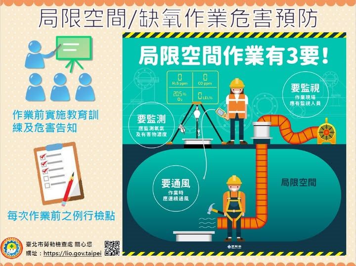 鑒於國內局限空間作業事故頻繁,如去(114)年民宅清洗溫泉蓄水池釀2命危,引起社會大眾對局限空間作業的高度重視。而北市政府工務局衛工處執行污水下水道作業,也常常面臨局限空間場所,為防範憾事發生,衛工處積極落實局限空間作業安全管理,確實執行3要動作,即「要通風、要監測、要監視」,並於權管場所設置「局限空間危害預防演練專區」,專門提供同仁及廠商教育訓練使用,以提昇專業知識及操作流程之熟練度,確保整體工作環境的安全性。