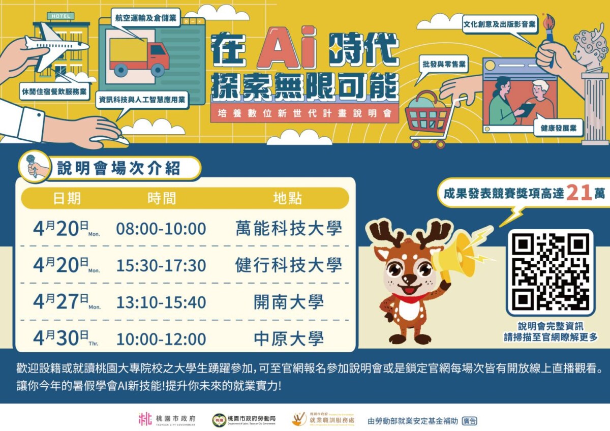 歡迎桃園各大專校院對數位技能與產業實務有興趣的學生踴躍參與。無法到場的同學也可透過線上方式參與,本次各場說明會皆安排同步直播,相關直播連結將於官⽅網站公告。若有興趣參與「桃園『有頭鹿』職能訓練場−培養數位新世代計畫」,亦可掃描圖上的QR碼至網站查詢詳細資訊並完成線上報名,共同加入「有頭鹿」職能訓練場,為AI時代提升自我的技能。