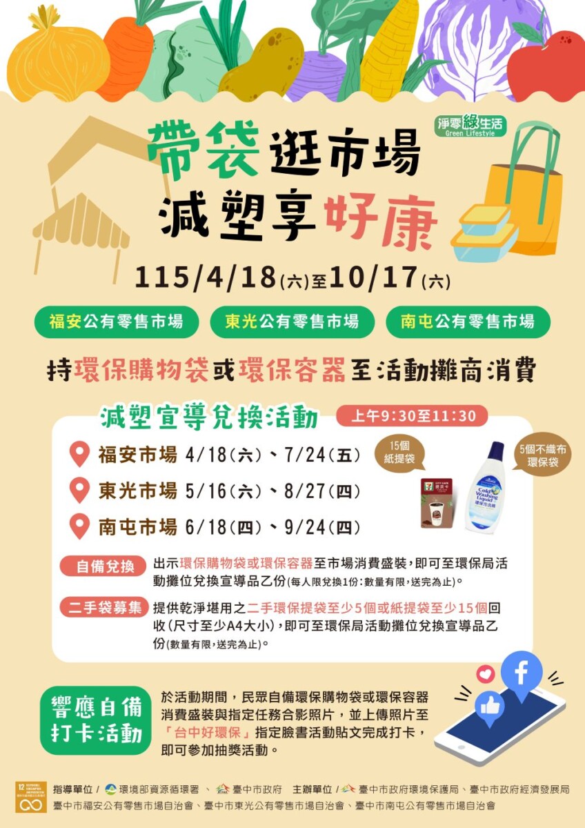 環保局表示,為加強源頭減塑宣傳及提升民眾參與意願,環保局今年結合台中市福安、東光及南屯等3處公有零售市場配合展開6場次巡迴設攤活動。此外,為減少使用塑膠袋,呼籲攤商響應不主動提供購物用塑膠袋及併袋盛裝,也鼓勵民眾外出購物時自備攜帶購物袋,省荷包又環保;若臨時有購物袋需求,可至市場、量販店、藥局及超市等276處「二手袋循環回收站」取用,有多餘的袋子亦可捐袋回收;環境部資源循環署近期也推出「袋袋相傳」二手袋循環平台(網址:https://sup.moenv.gov.tw/Page/rebag),歡迎有捐袋意願者或有二手袋需求商家,可上該平台了解及登錄,讓資源循環共享不浪費。