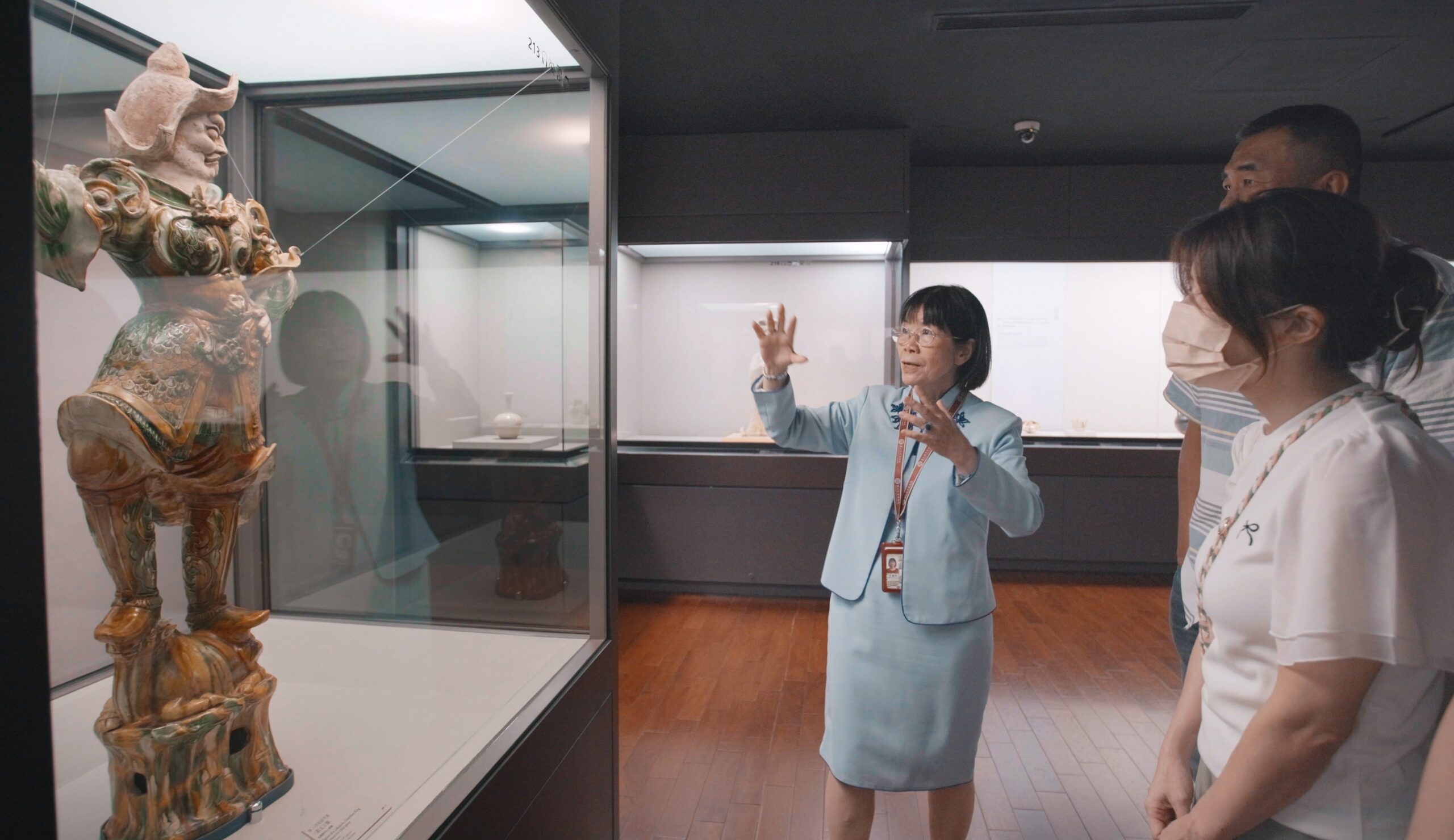 服務超過三十五年的資深導覽志工王雪吟(左)認為,導覽不只是背誦資料,更要與文物建立連結,將知識轉化為故事,讓觀眾真正走進歷史。  圖片提供:公視