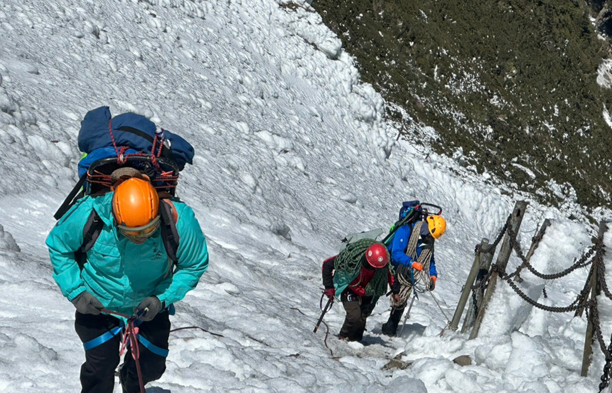 玉山冬季冰岩地形倍增險峻,跟著資深保育巡查員一步步引導垂降救援(玉管處提供)