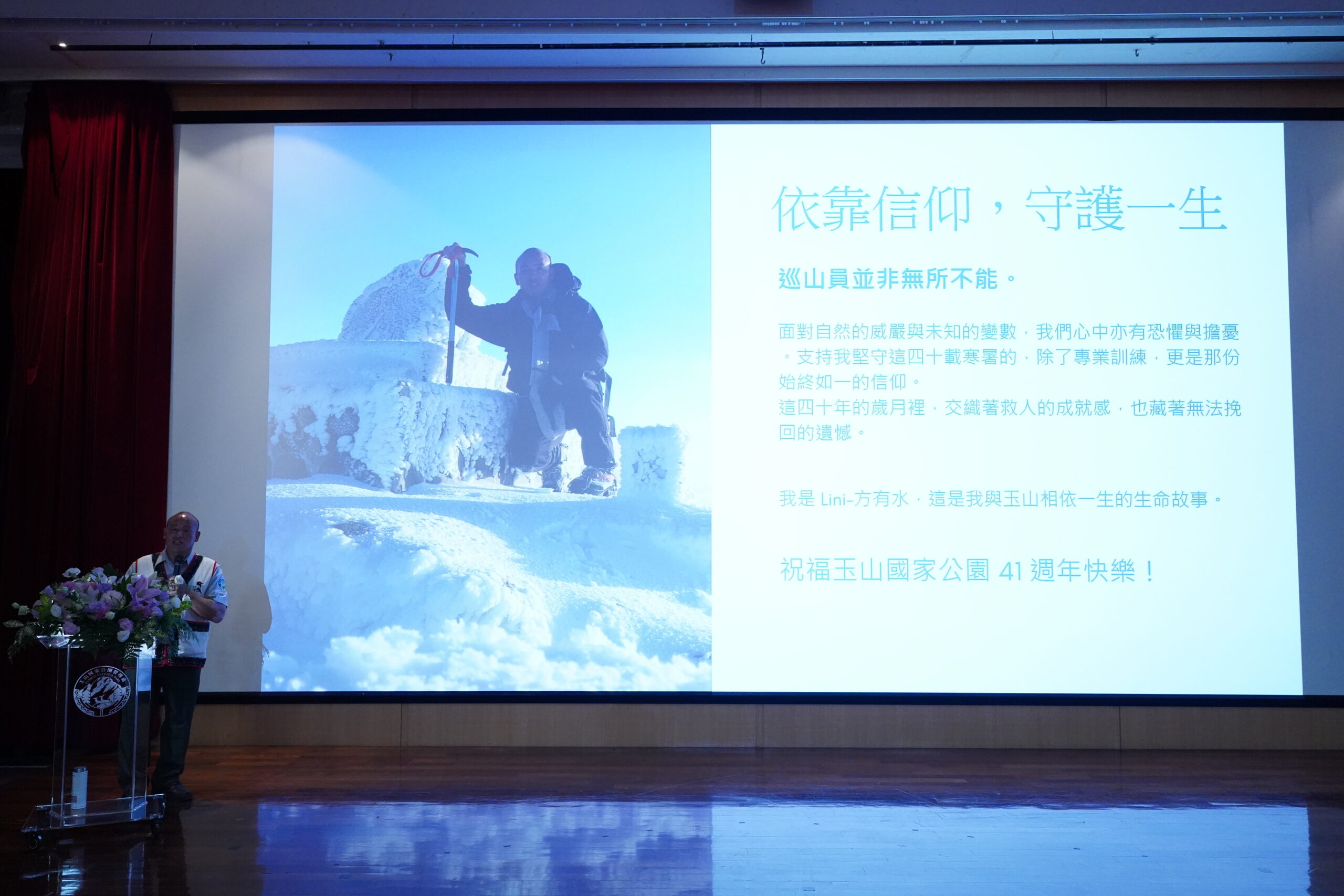 玉管處說明,本次處慶由管處布農族保育巡查員組成的「布農大叔合唱團」揭開序幕,以深沉和諧的天籟布農美音迎賓感恩。活動焦點之一為玉管處同仁親自執導並獲獎的《雲上守護者》的分享,詳實記錄第一屆巡山員(現改稱保育巡查員)方有水先生的守護歲月。今日方有水保育巡查員親自前來分享40多年來執勤實況,從艱辛的環境清理、嚴謹的生態監測,到高風險的山難救援與步道維護,展現了保育巡查員多元且紮實的工作全貌。透過「水里影展」策展人洪馬克導演與新舊世代巡查員的深度對話,傳遞山域守護經驗傳承的重要性,在此向所有巡山員致敬。這種結合實務影像與經驗分享的方式,能讓民眾更全面認識國家公園第一線工作的挑戰與價值。