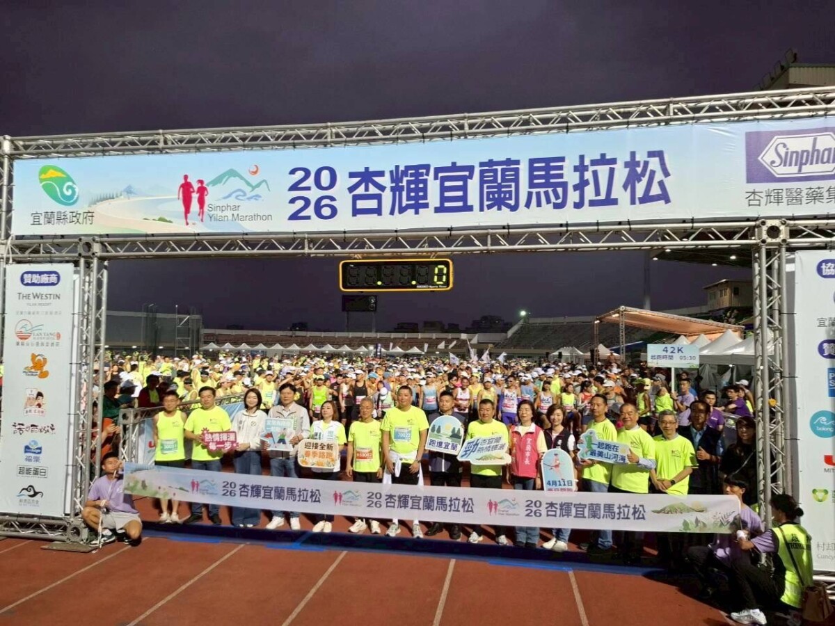 第五屆「2026杏輝宜蘭馬拉松」於(11)日清晨5時在宜蘭運動公園田徑場熱鬧揭幕。今年賽事首度由往年的11月份移至春季舉行,宜人的氣候吸引各地超過3,000位跑者共襄盛舉,參賽人數創下歷年新高。當天宜蘭縣代理縣長林茂盛、杏輝醫藥集團董事長李志文及副董事長李易達的鳴槍下熱鬧開跑。本屆賽事以「勁杏宜蘭熱情輝灑」為主題,完美結合運動與觀光旅遊。